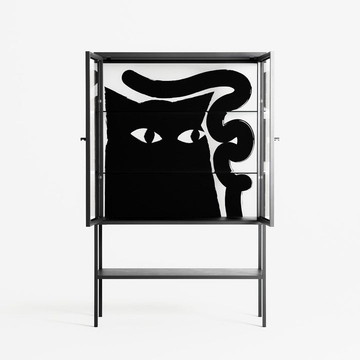 Black Cat by Konrad Blaszczyk, displayed within the Vitrine Loft Cabinet behind Clear glass. Finished in the colour Antracite, the cabinet becomes a frame for the artwork and the objects within.