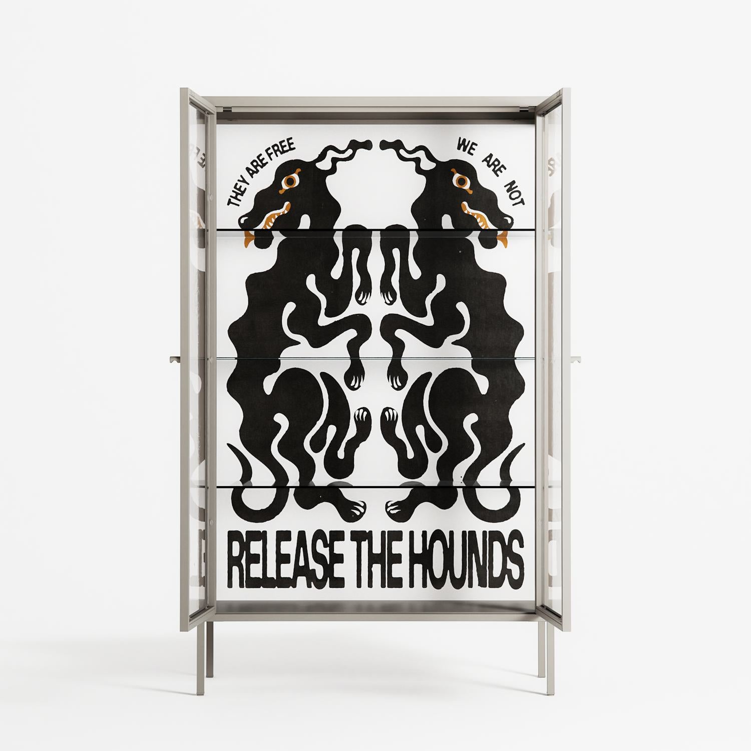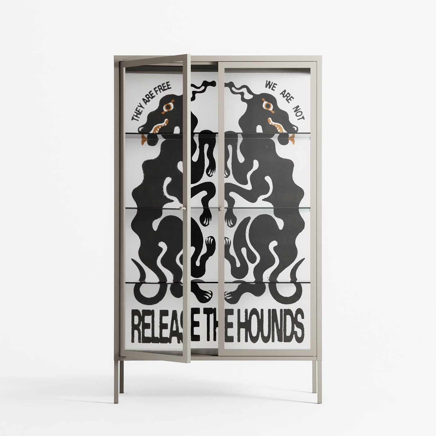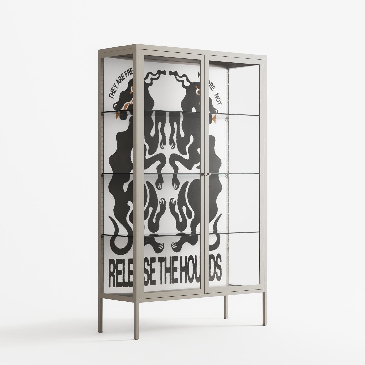 Hounds by Alexander Khabbazi, displayed within the Vitrine Cabinet behind Clear glass. Finished in the colour Pebble, the cabinet becomes a frame for the artwork and the objects within.