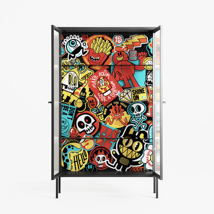 All The Stickers by Craig Watkins, displayed within the Vitrine Cabinet behind Reeded glass. Finished in the colour Antracite, the cabinet becomes a frame for the artwork and the objects within.