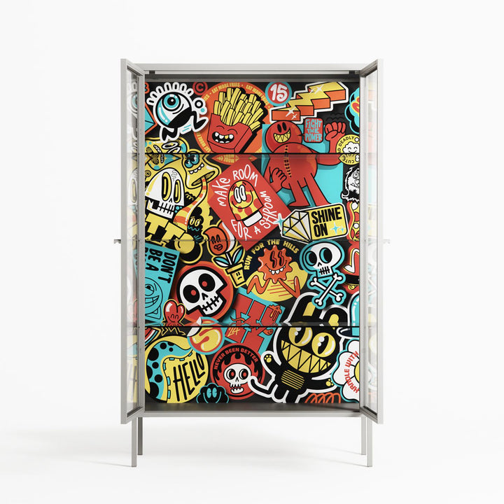 All The Stickers by Craig Watkins, displayed within the Vitrine Cabinet behind Clear glass. Finished in the colour Chalk, the cabinet becomes a frame for the artwork and the objects within.