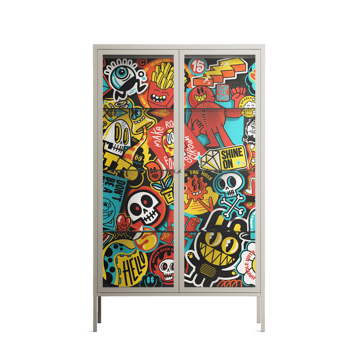 All The Stickers by Craig Watkins, displayed within the Vitrine Cabinet behind Clear glass. Finished in the colour Pebble, the cabinet becomes a frame for the artwork and the objects within.