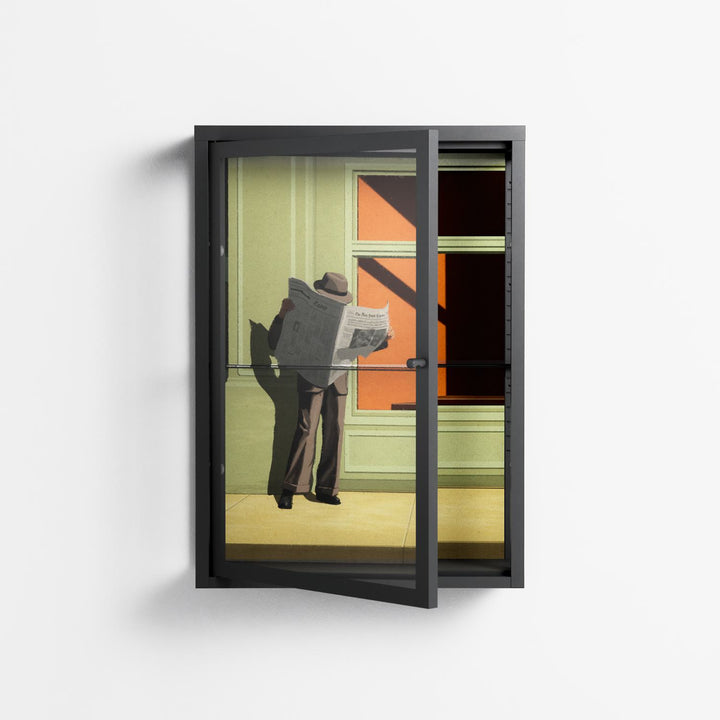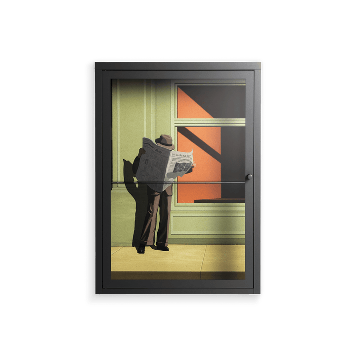 Anonymous Reader by Kristin Eriksson, displayed within the Vitrine Wall Cabinet behind Clear glass. Finished in the colour Antracite, the cabinet becomes a frame for the artwork and the objects within.
