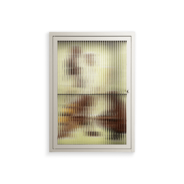 Can You Face It by Sophie Goudman-Peachey, displayed within the Vitrine Wall Cabinet behind Reeded glass. Finished in the colour Pebble, the cabinet becomes a frame for the artwork and the objects within.