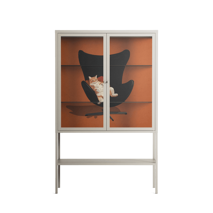 Cat in Chair B by Kristin Eriksson, displayed within the Vitrine Loft Cabinet behind Clear glass. Finished in the colour Pebble, the cabinet becomes a frame for the artwork and the objects within.