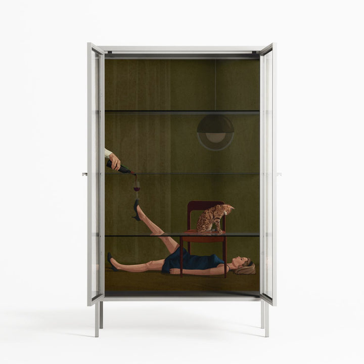 Friday Night Rituals by Kristin Eriksson, displayed within the Vitrine Cabinet behind Clear glass. Finished in the colour Chalk, the cabinet becomes a frame for the artwork and the objects within.