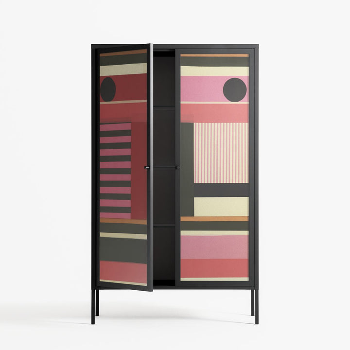 Harmonic by Rikki Hewitt, portrayed on the glass panels of the Vitrine Cabinet. Finished in the colour Antracite, the cabinet blends artwork and objects into a single visual story.