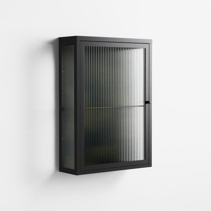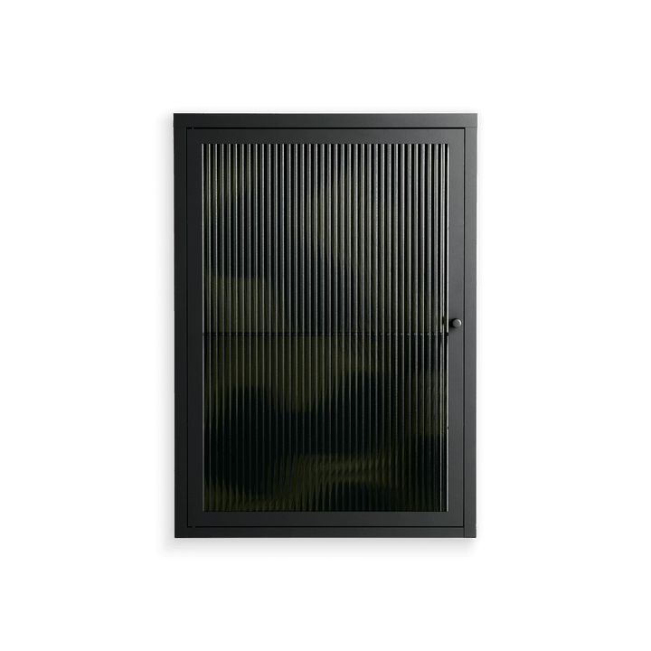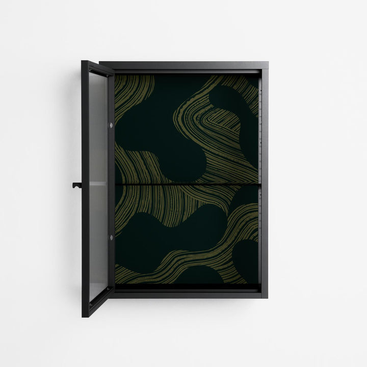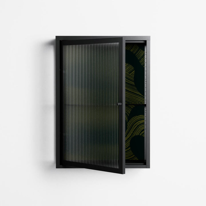 Midnight Dune by Amy Suther, displayed within the Vitrine Wall Cabinet behind Reeded glass. Finished in the colour Antracite, the cabinet becomes a frame for the artwork and the objects within.