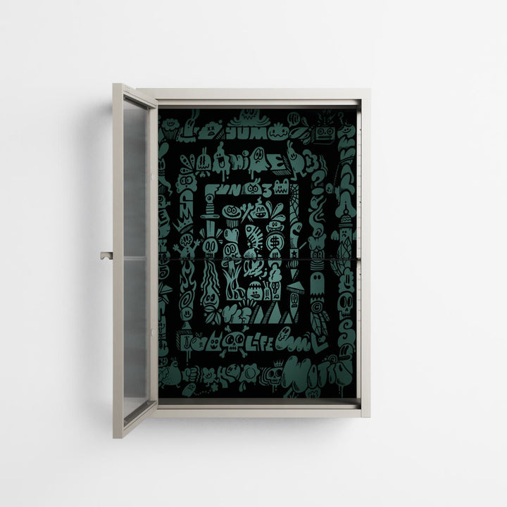 Vitrine pairs artworks by artists, designers, and creatives from around the world with a frame that elevates and displays them in everyday space. The cabinet is built from precision-cut metal with a powder-coated finish — resistant to wear and crafted for stability — making it ideal for both office and home spaces.
