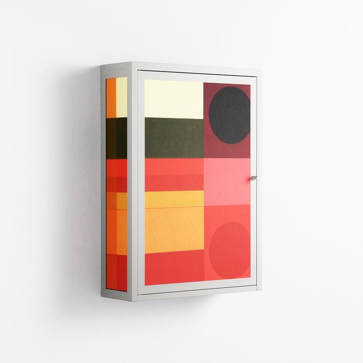 Turnstile by Rikki Hewitt, artistically portrayed on the Vitrine Wall Cabinet. Finished in the colour Chalk, the cabinet blends artwork and object together.