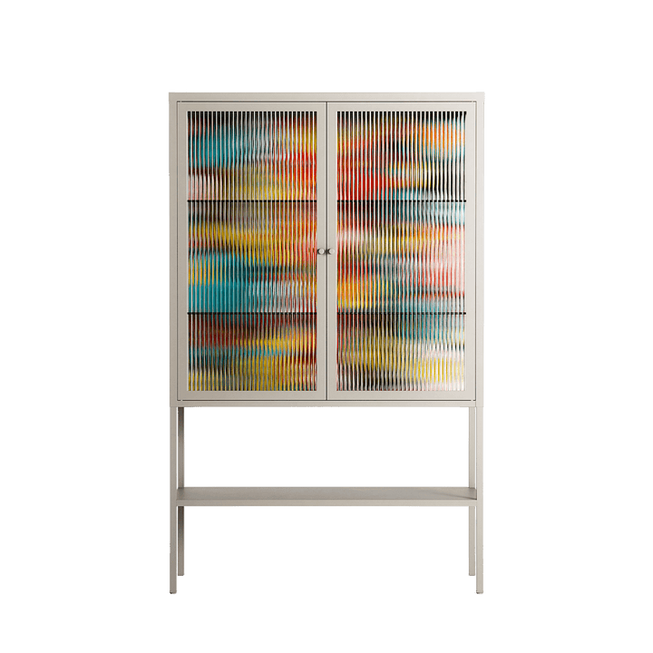 All The Stickers by Craig Watkins, displayed within the Vitrine Loft Cabinet behind Reeded glass. Finished in the colour Pebble, the cabinet becomes a frame for the artwork and the objects within.