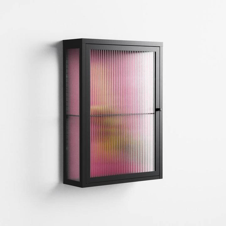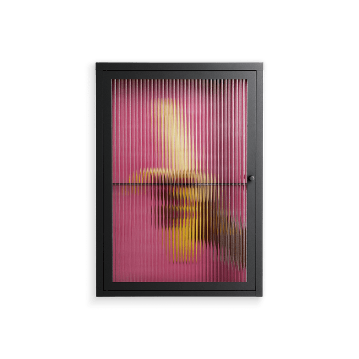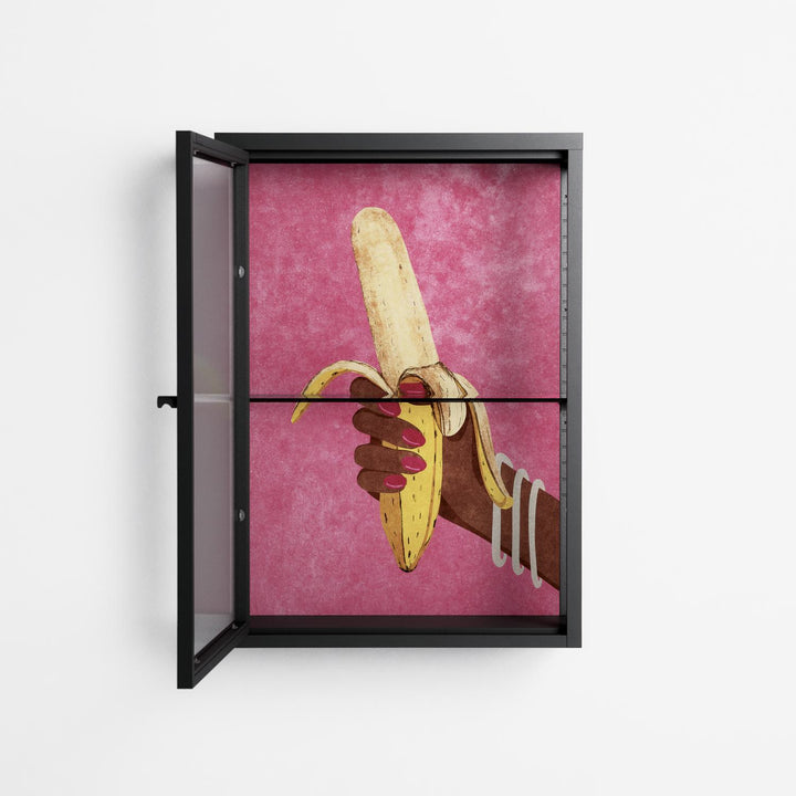 Banana by Raissa Oltmanns, displayed within the Vitrine Wall Cabinet behind Reeded glass. Finished in the colour Antracite, the cabinet becomes a frame for the artwork and the objects within.