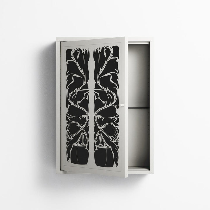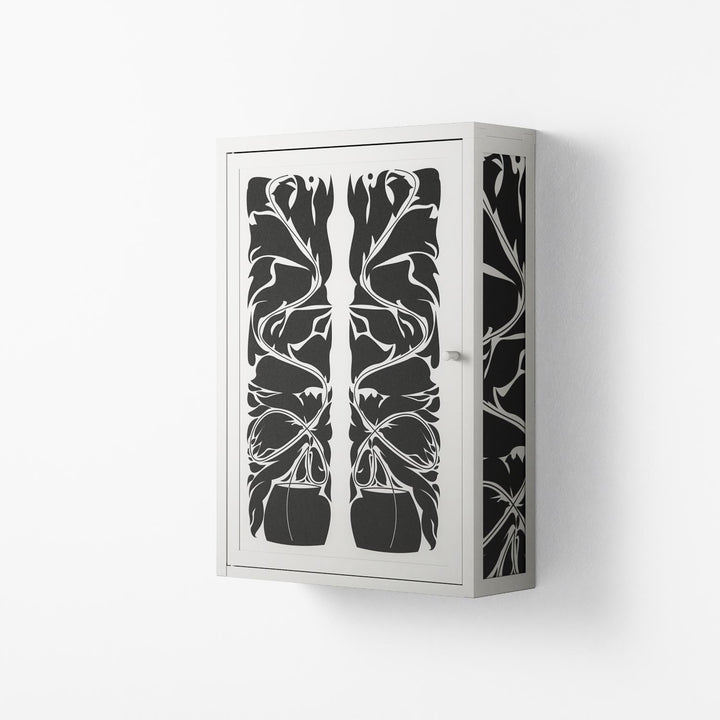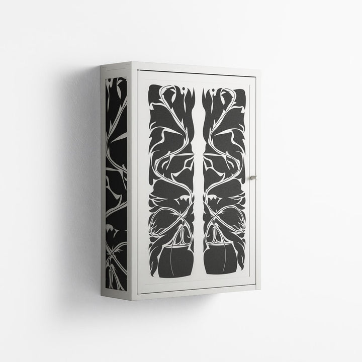 Black Potted Plant by Konrad Blaszczyk, artistically portrayed on the Vitrine Wall Cabinet. Finished in the colour Chalk, the cabinet blends artwork and object together.