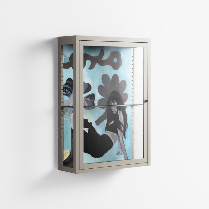 Day Dream by Sophie Goudman-Peachey, displayed within the Vitrine Wall Cabinet behind Clear glass. Finished in the colour Pebble, the cabinet becomes a frame for the artwork and the objects within.