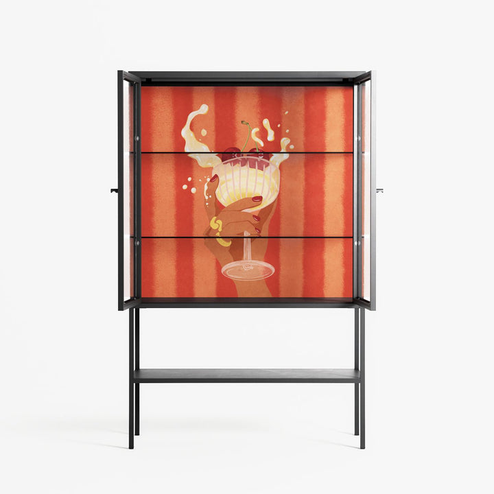Drink And Cherries by Raissa Oltmanns, displayed within the Vitrine Loft Cabinet behind Clear glass. Finished in the colour Antracite, the cabinet becomes a frame for the artwork and the objects within.