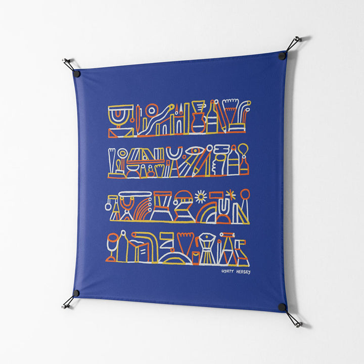 Shelves by Wyatt Hersey, printed on premium cotton canvas and displayed with WOW. Work on Wall is Workdeco’s signature frameless suspension system—art floating freely with no frame, no glass, just the work and the wall.