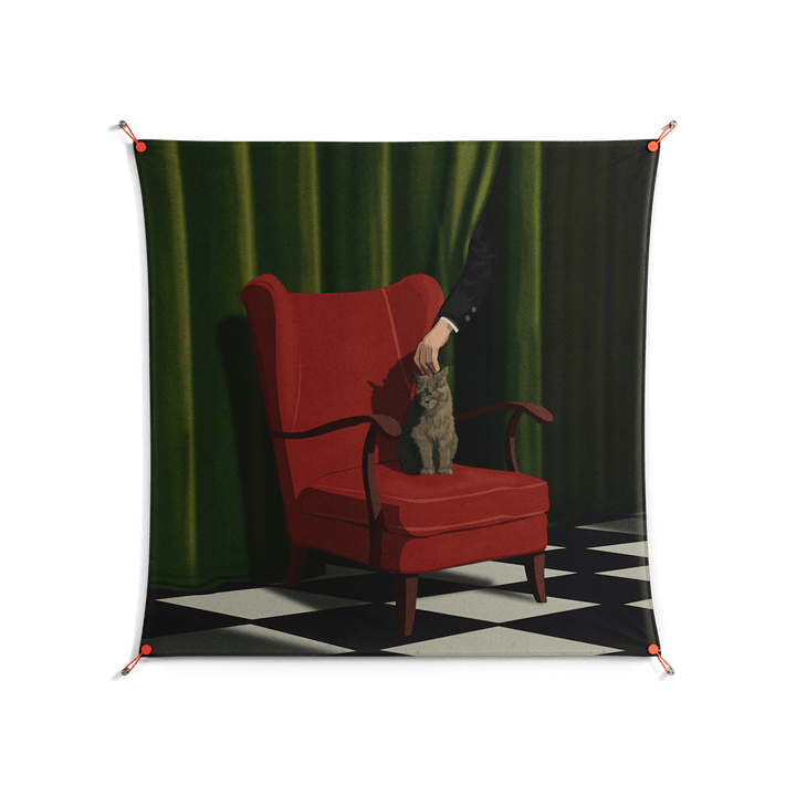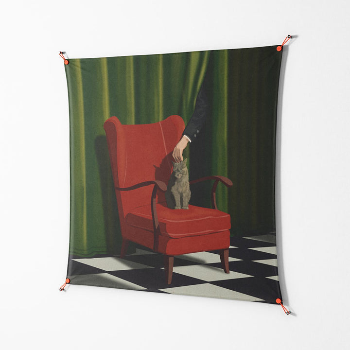 The Man Behind The Curtain by Kristin Eriksson, printed on premium cotton canvas and displayed with WOW. Work on Wall is Workdeco’s signature frameless suspension system—art floating freely with no frame, no glass, just the work and the wall.