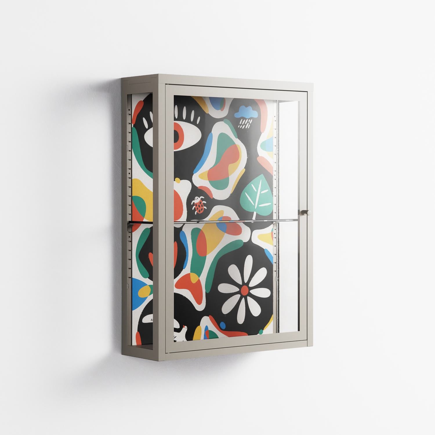 Alive by Vratislav Pecka, displayed within the Vitrine Wall Cabinet behind Clear glass. Finished in the colour Pebble, the cabinet becomes a frame for the artwork and the objects within.