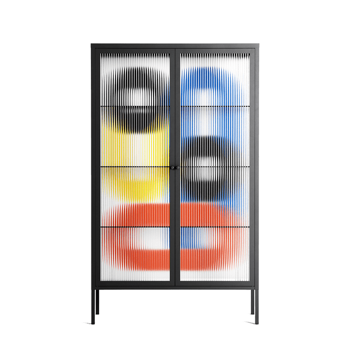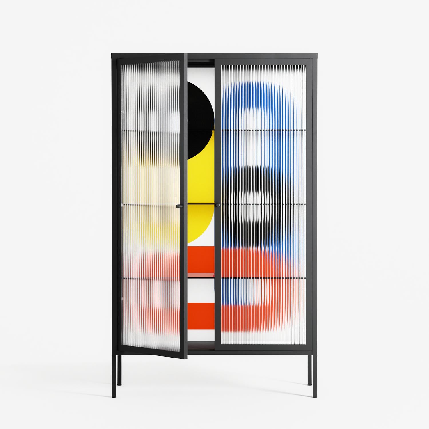 Arial by Vratislav Pecka, displayed within the Vitrine Cabinet behind Reeded glass. Finished in the colour Antracite, the cabinet becomes a frame for the artwork and the objects within.
