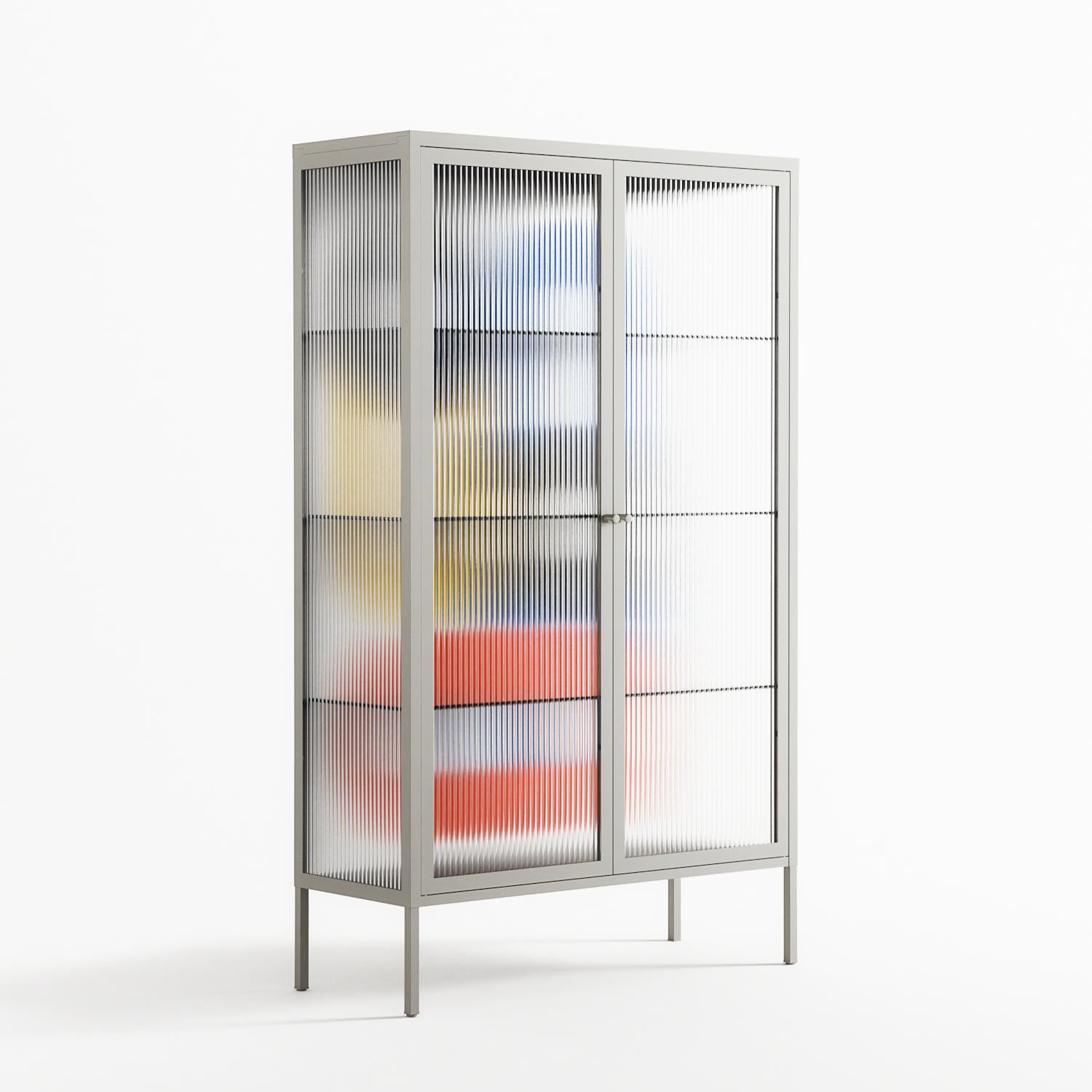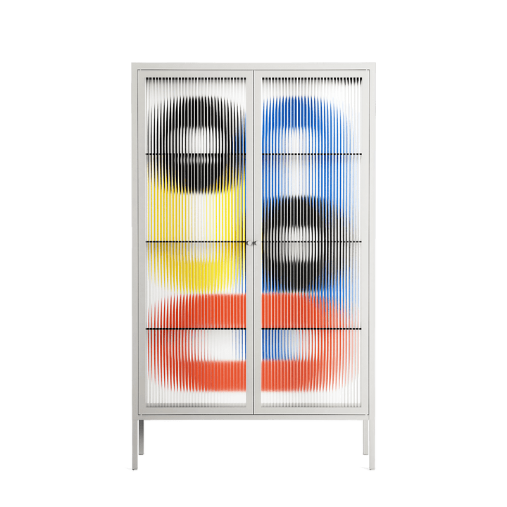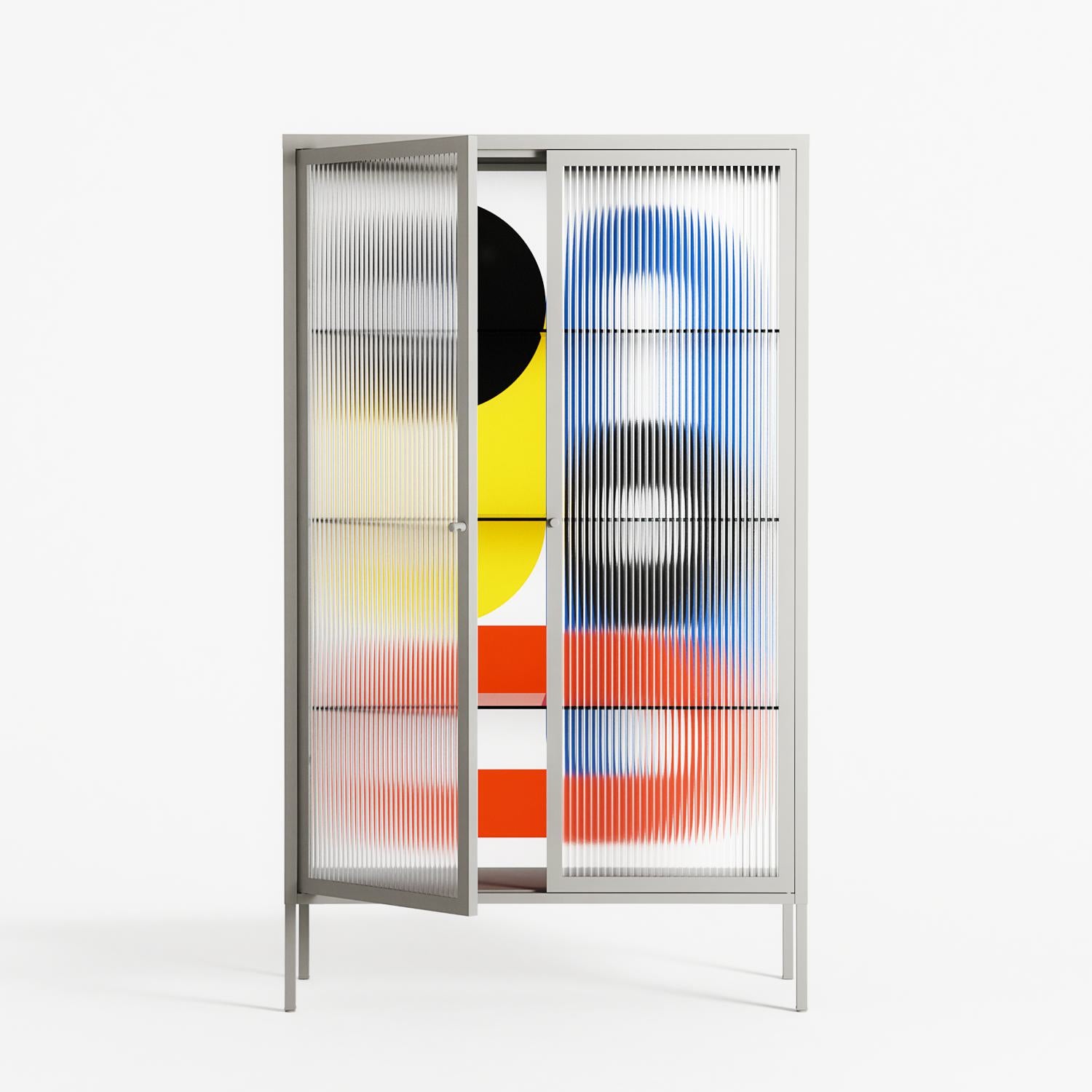 Arial by Vratislav Pecka, displayed within the Vitrine Cabinet behind Reeded glass. Finished in the colour Chalk, the cabinet becomes a frame for the artwork and the objects within.