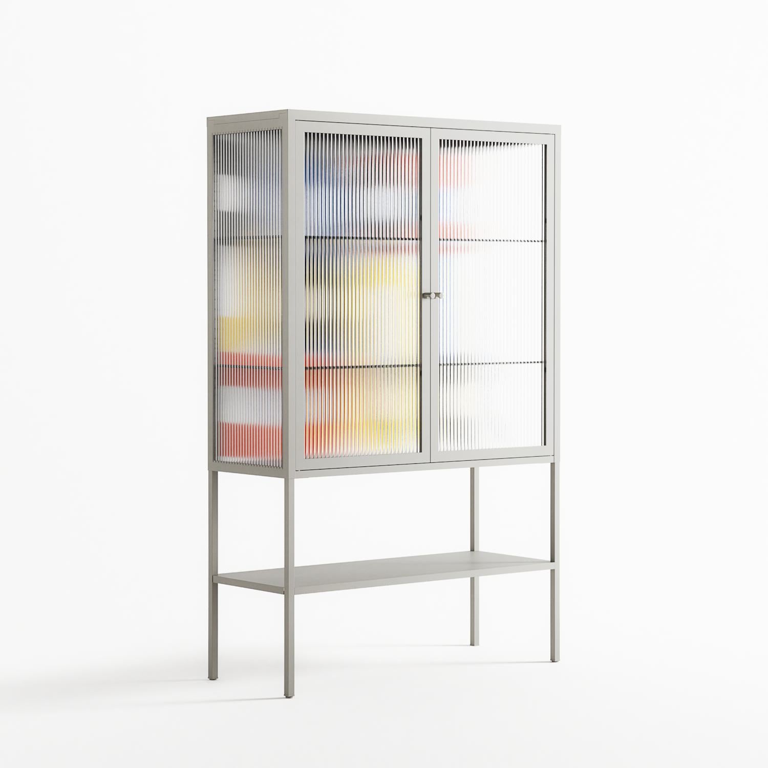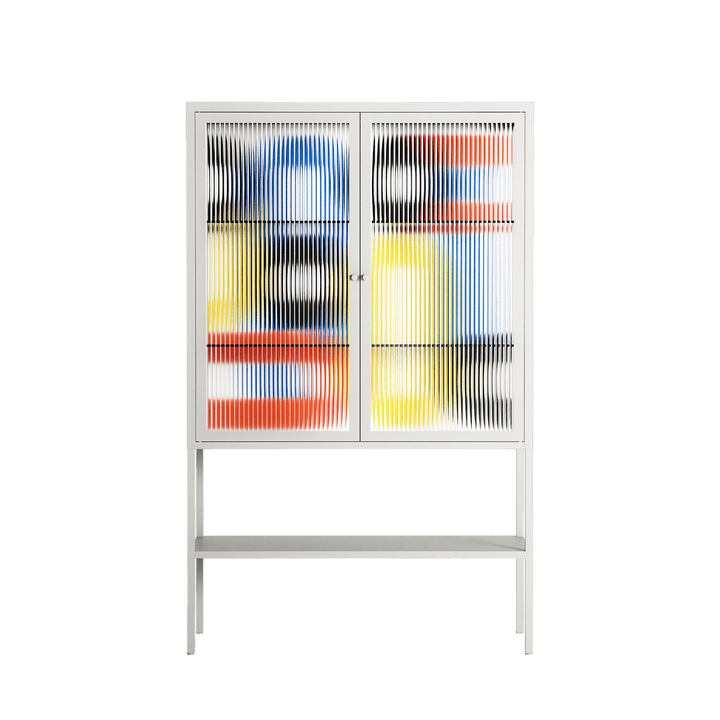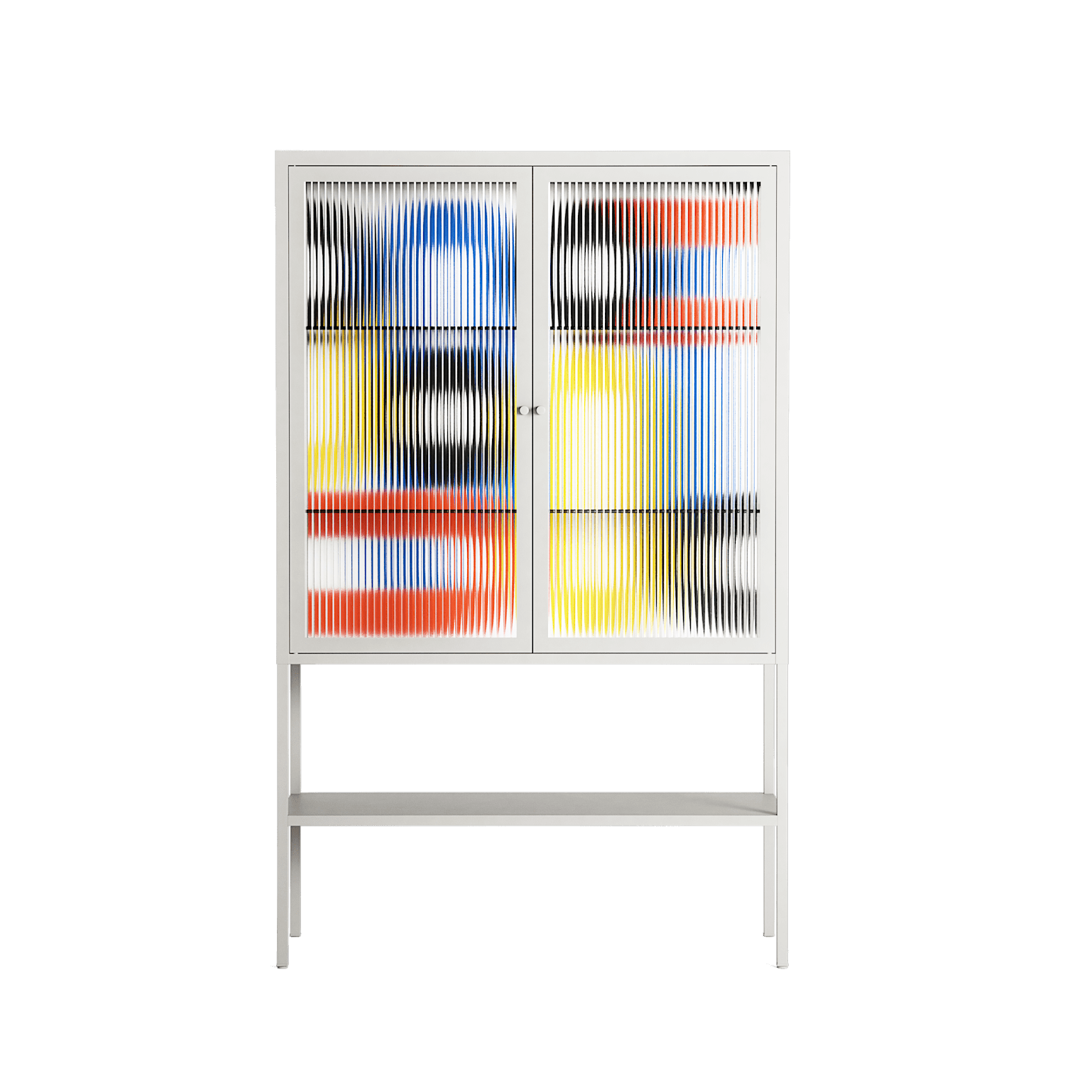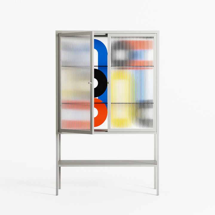 Arial by Vratislav Pecka, displayed within the Vitrine Loft Cabinet behind Reeded glass. Finished in the colour Chalk, the cabinet becomes a frame for the artwork and the objects within.