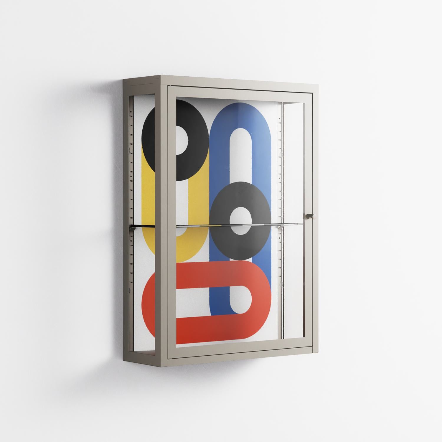 Arial by Vratislav Pecka, displayed within the Vitrine Wall Cabinet behind Clear glass. Finished in the colour Pebble, the cabinet becomes a frame for the artwork and the objects within.