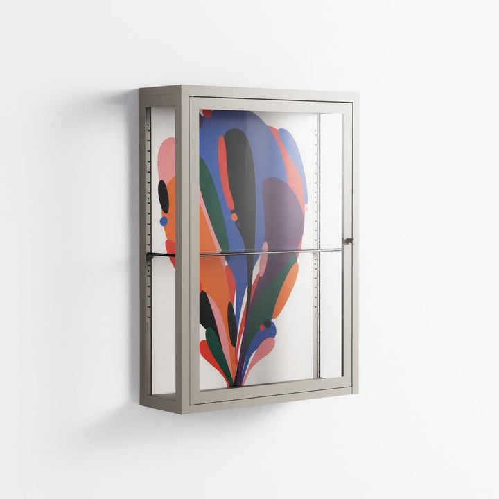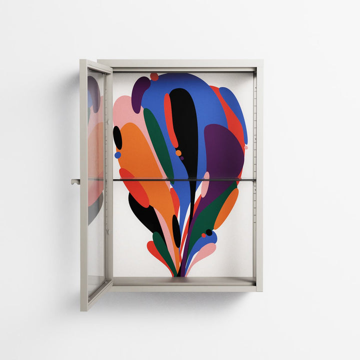 Balloons by Vratislav Pecka, displayed within the Vitrine Wall Cabinet behind Clear glass. Finished in the colour Pebble, the cabinet becomes a frame for the artwork and the objects within.