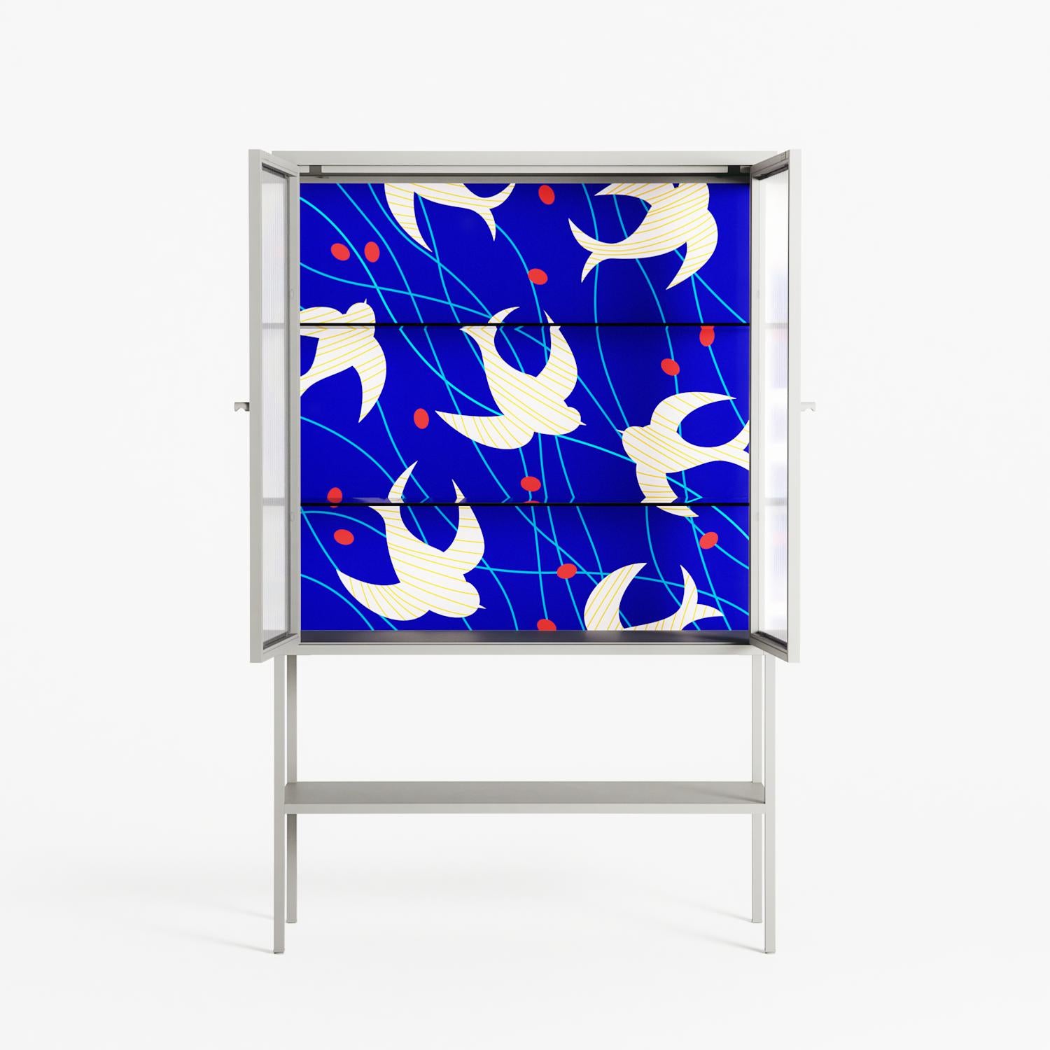 Birds A by Heather Zhou, displayed within the Vitrine Loft Cabinet behind Reeded glass. Finished in the colour Chalk, the cabinet becomes a frame for the artwork and the objects within.