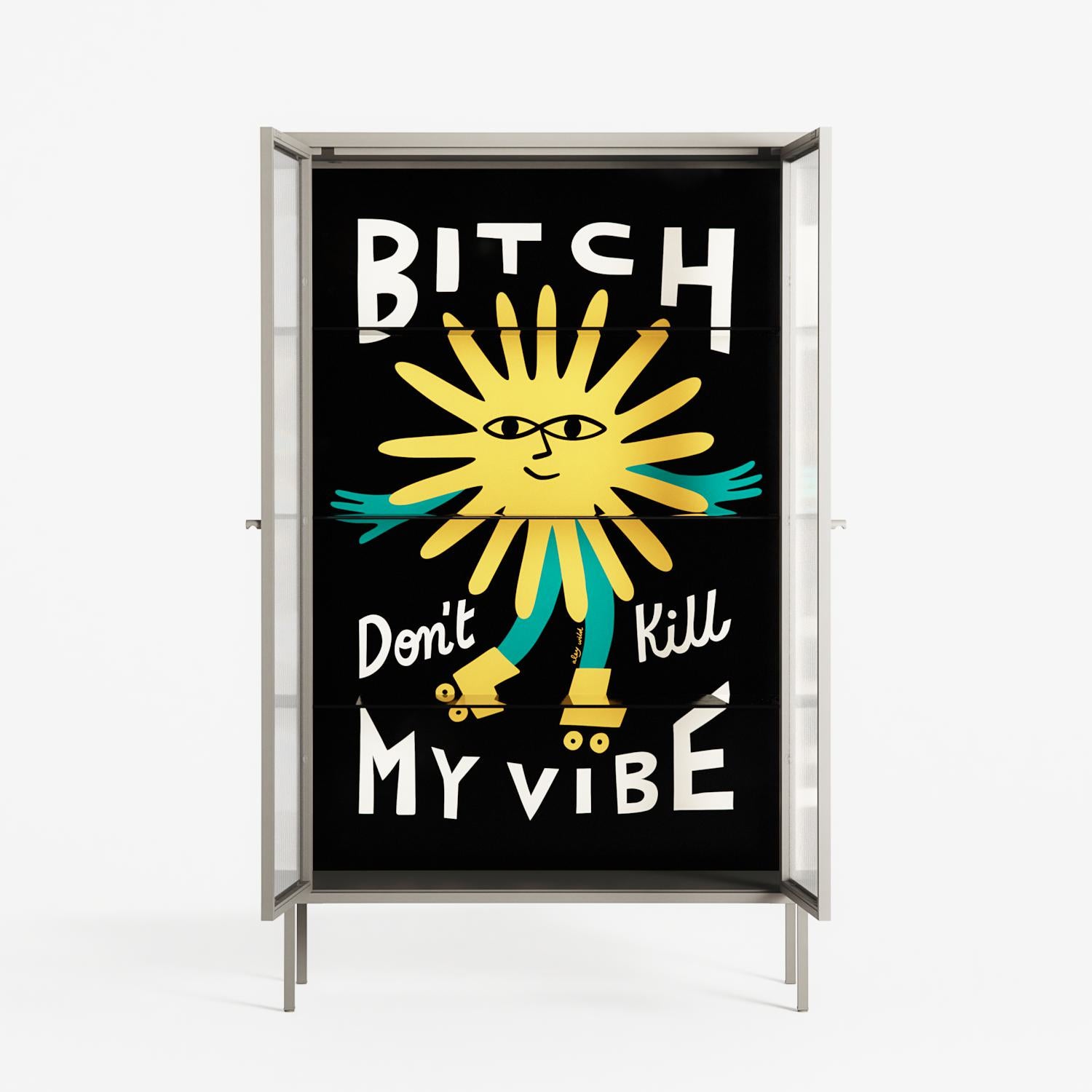 Bitch Don't Kill My Vibe by Aley Wild, displayed within the Vitrine Cabinet behind Reeded glass. Finished in the colour Pebble, the cabinet becomes a frame for the artwork and the objects within.