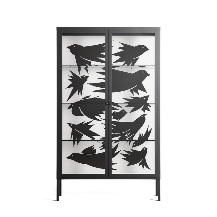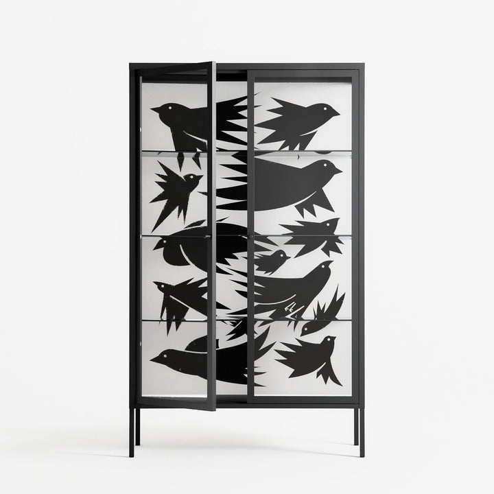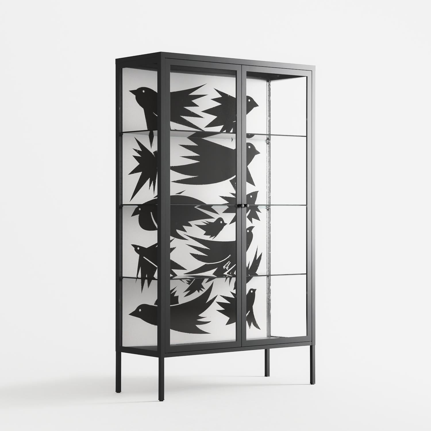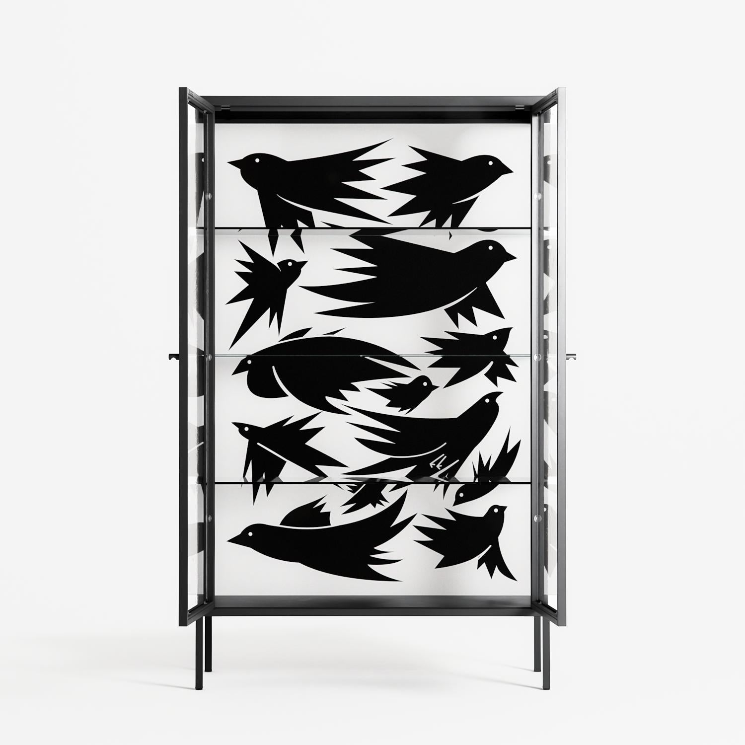 Black Birds by Konrad Blaszczyk, displayed within the Vitrine Cabinet behind Clear glass. Finished in the colour Antracite, the cabinet becomes a frame for the