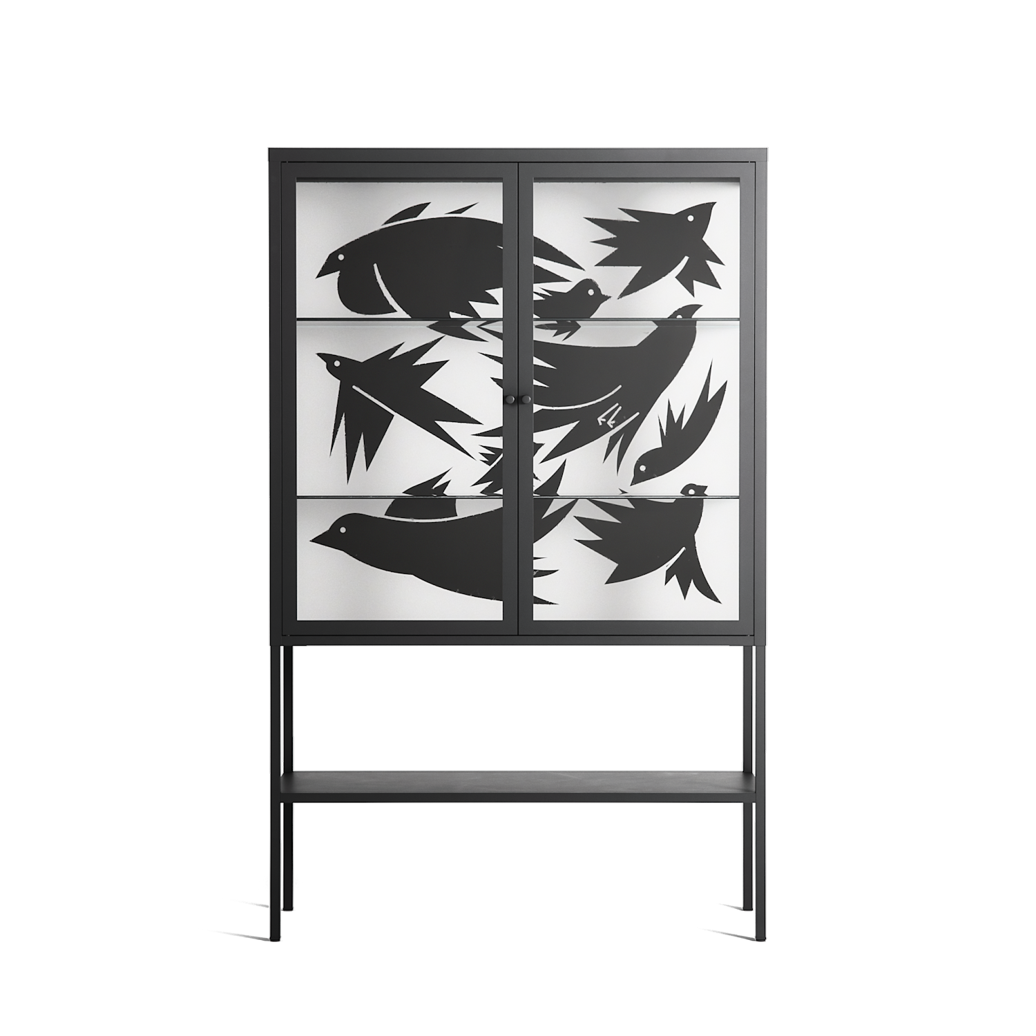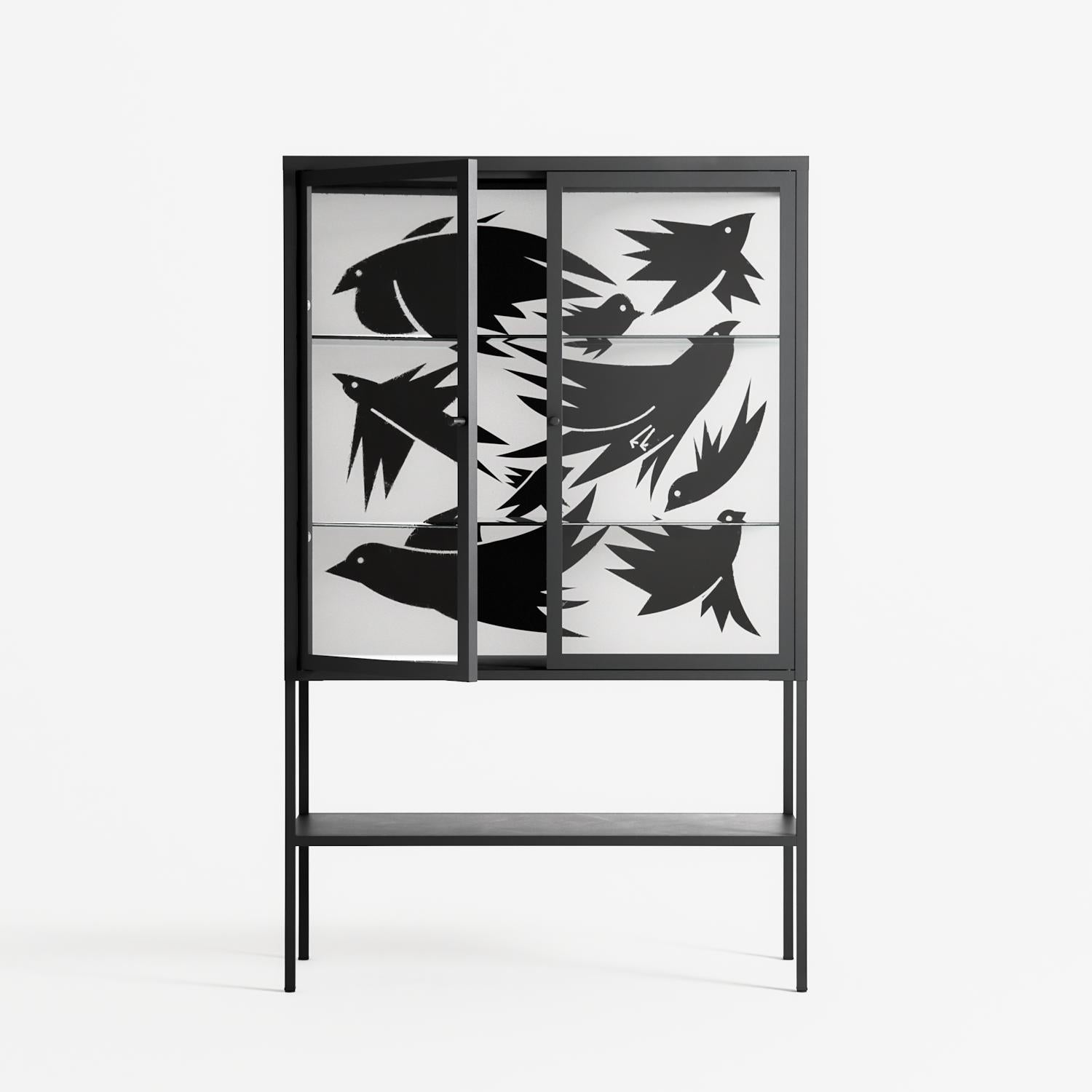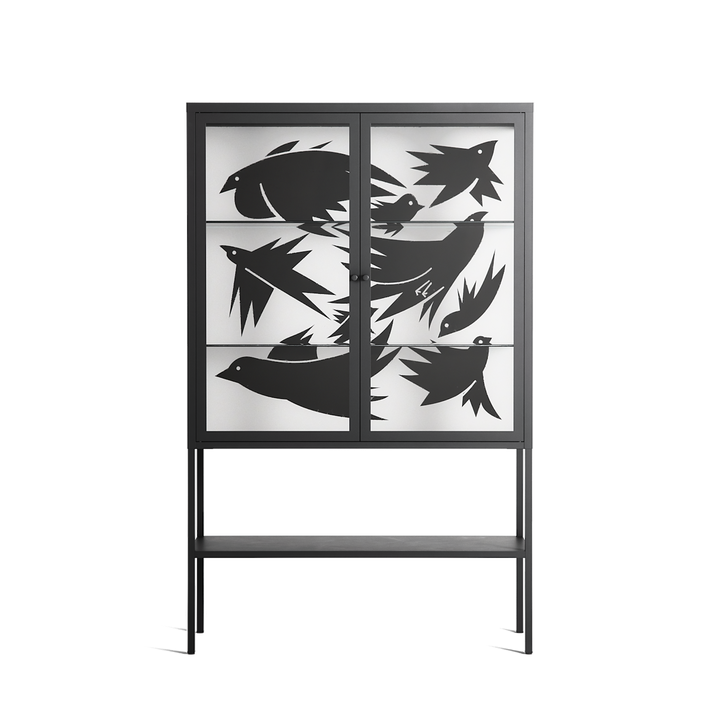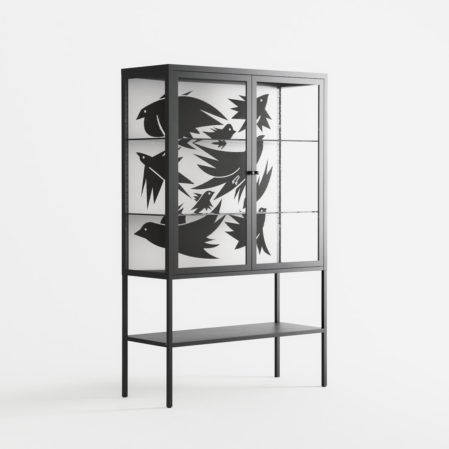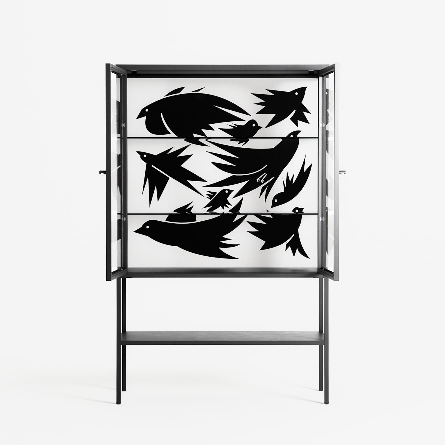 Black Birds by Konrad Blaszczyk, displayed within the Vitrine Loft Cabinet behind Clear glass. Finished in the colour Antracite, the cabinet becomes a frame for