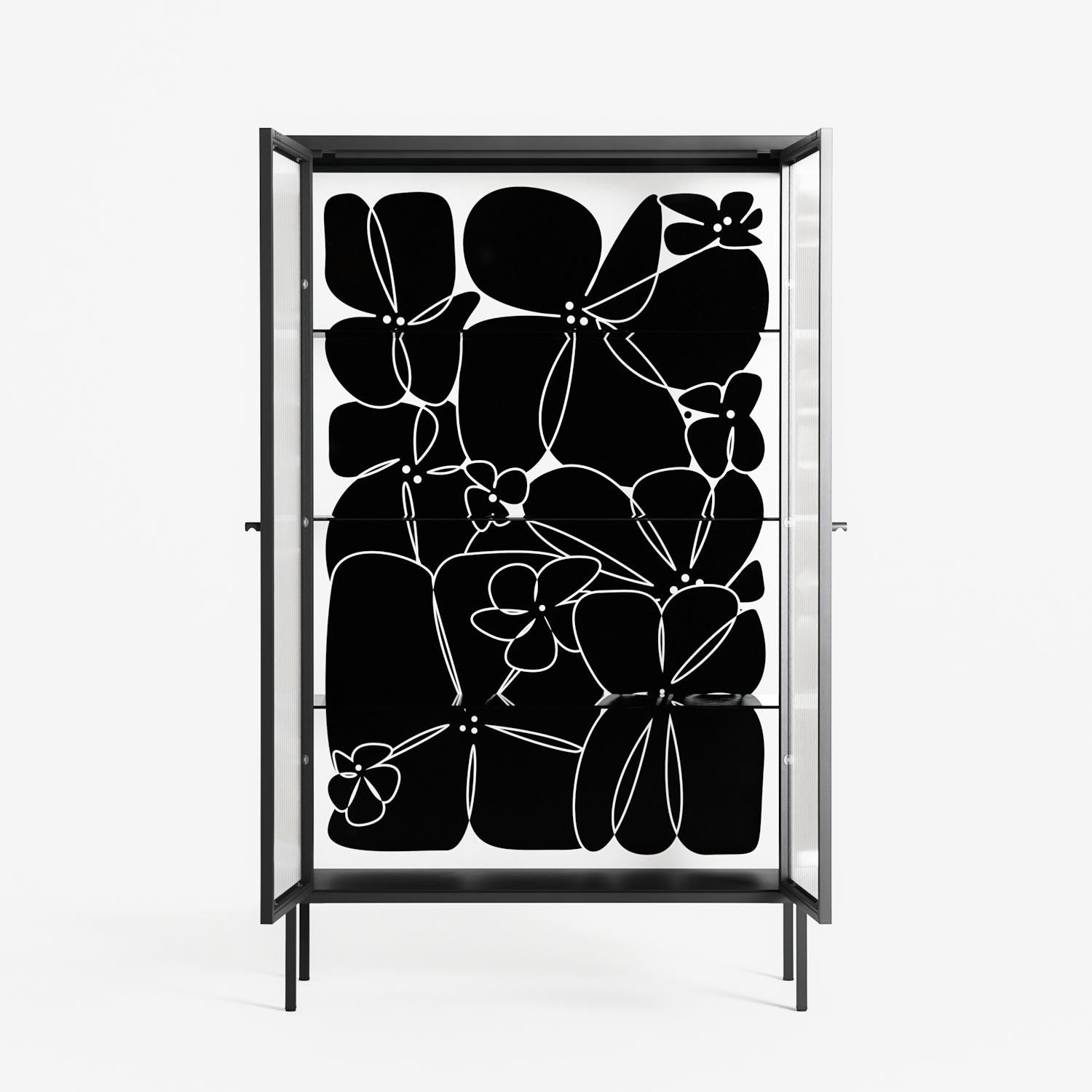Black Flower by Konrad Blaszczyk, displayed within the Vitrine Cabinet behind Reeded glass. Finished in the colour Antracite, the cabinet becomes a frame for the artwork and the objects within.
