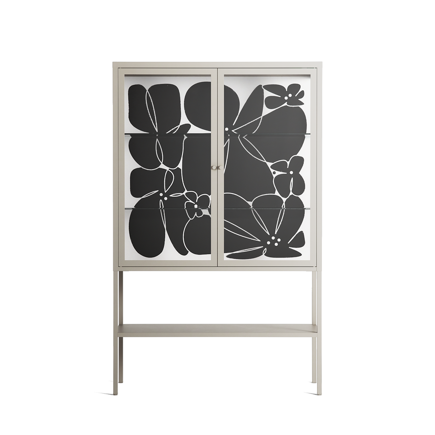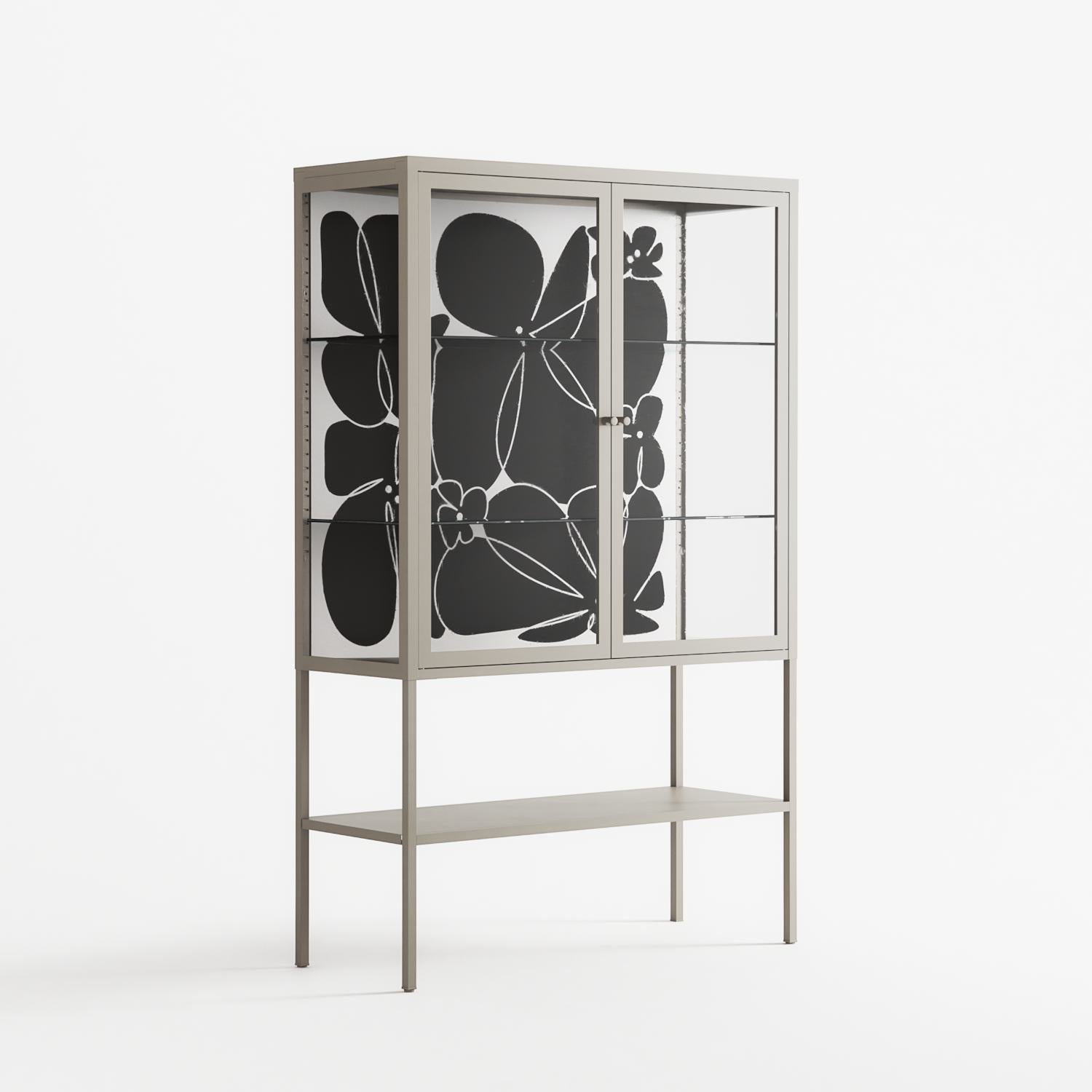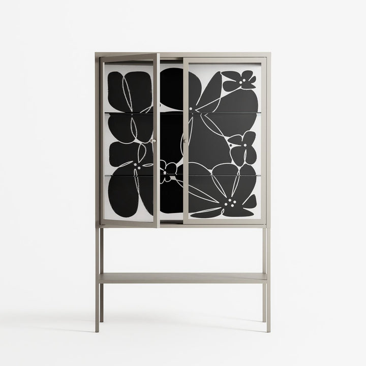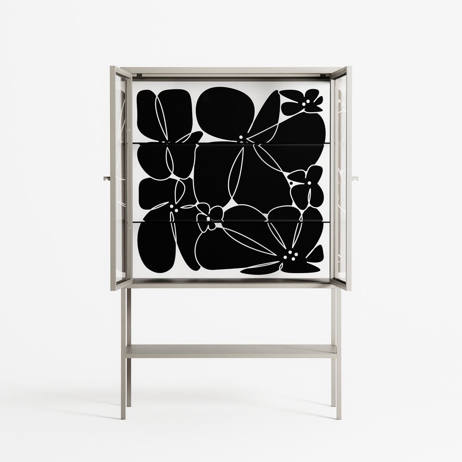 Black Flower by Konrad Blaszczyk, displayed within the Vitrine Loft Cabinet behind Clear glass. Finished in the colour Pebble, the cabinet becomes a frame for the artwork and the objects within.