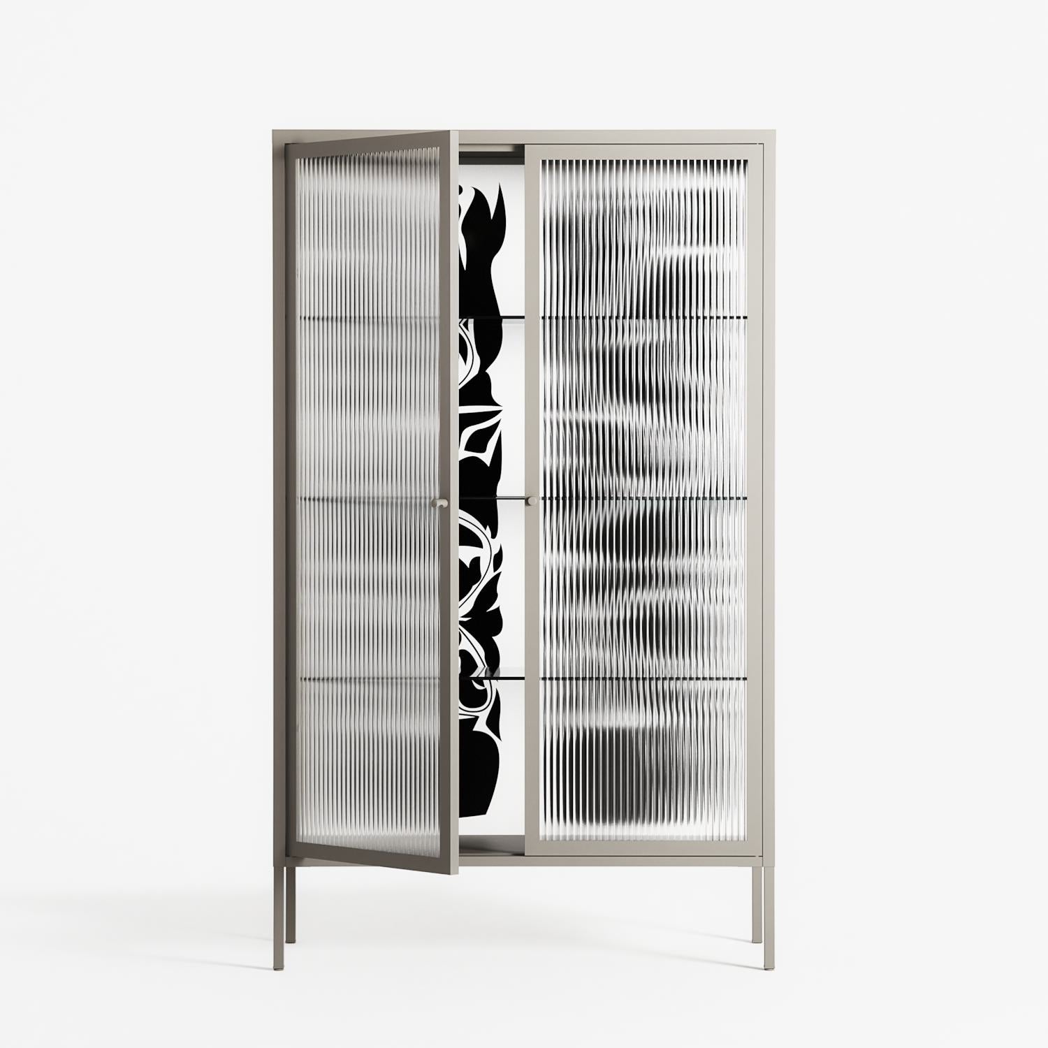 Black Potted Plant by Konrad Blaszczyk, displayed within the Vitrine Cabinet behind Reeded glass. Finished in the colour Pebble, the cabinet becomes a frame for the artwork and the objects within.