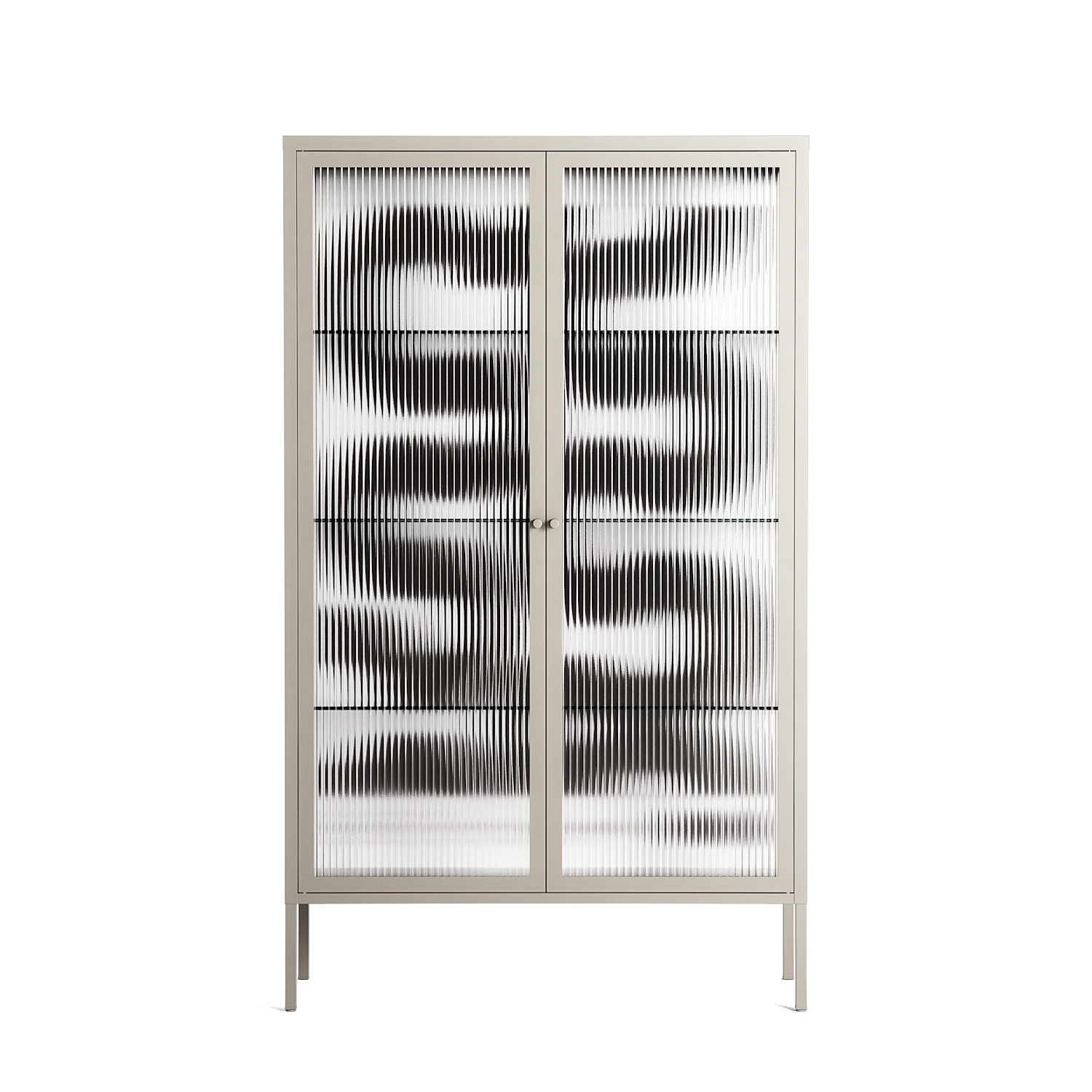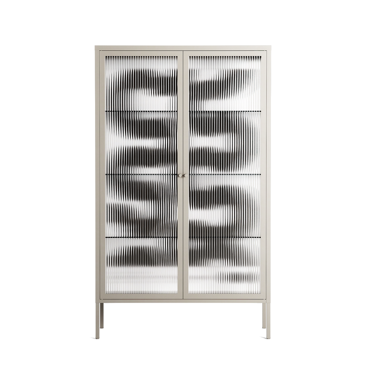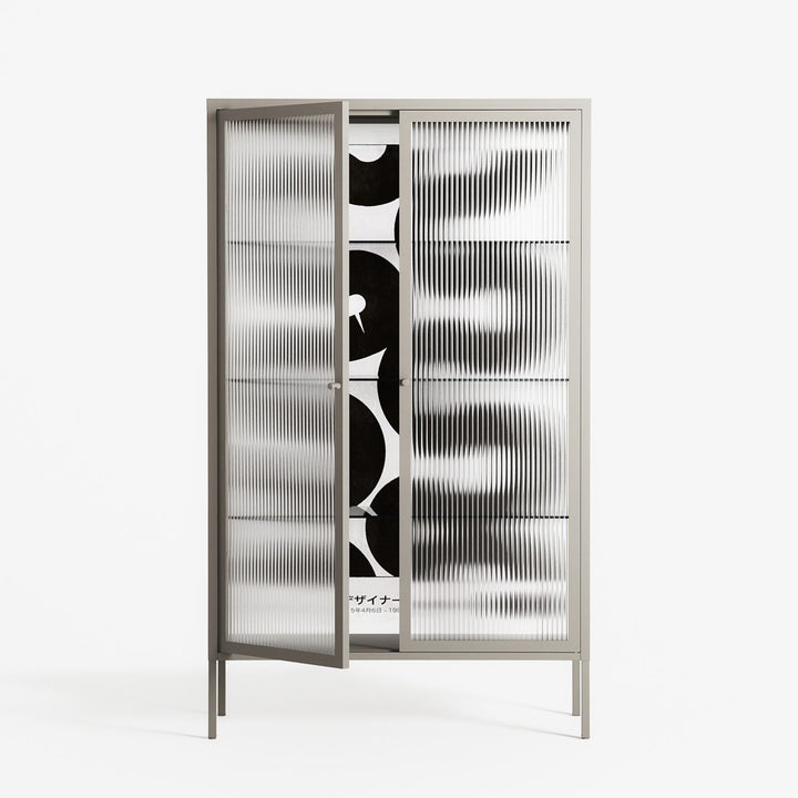 Black Waves by Alexander Khabbazi, displayed within the Vitrine Cabinet behind Reeded glass. Finished in the colour Pebble, the cabinet becomes a frame for the artwork and the objects within.