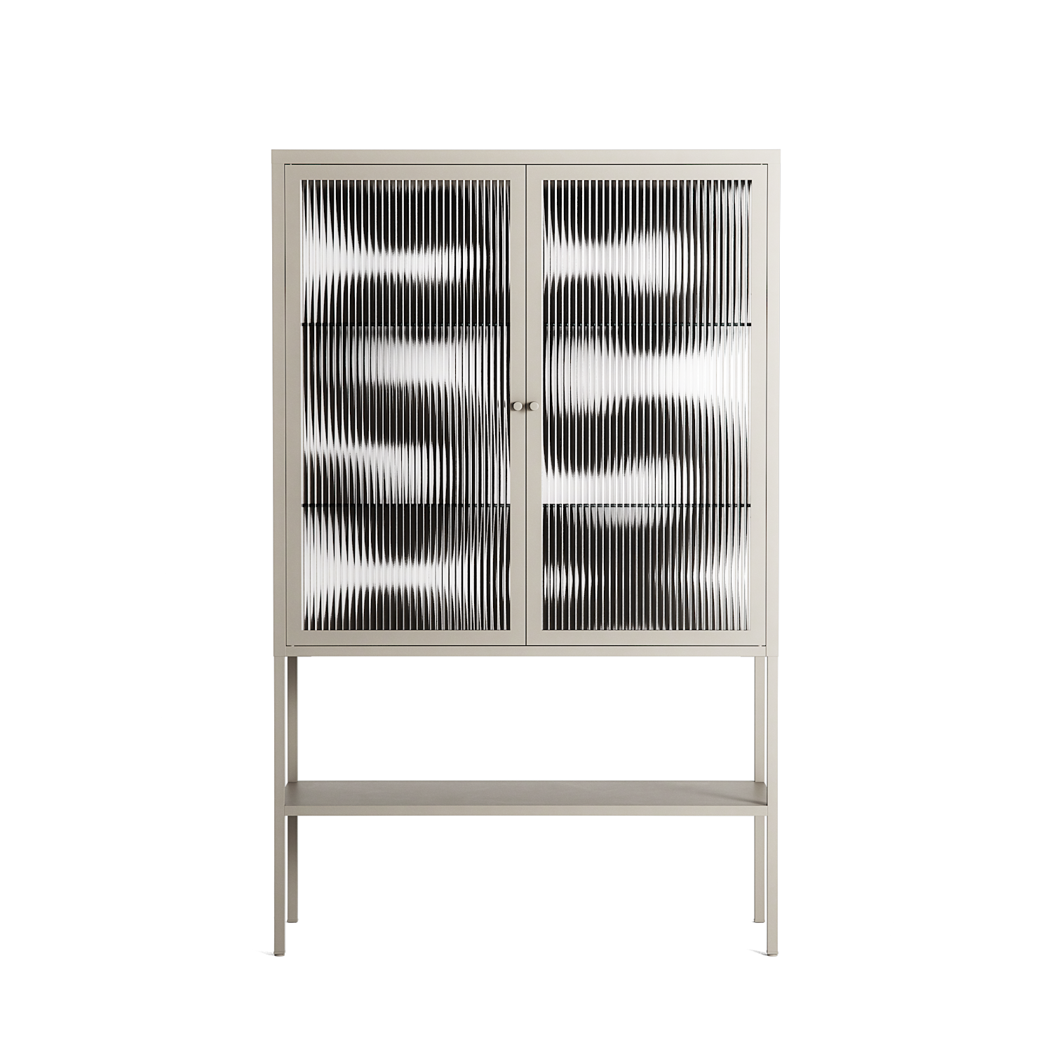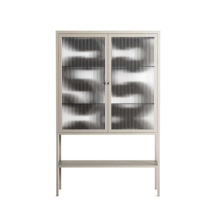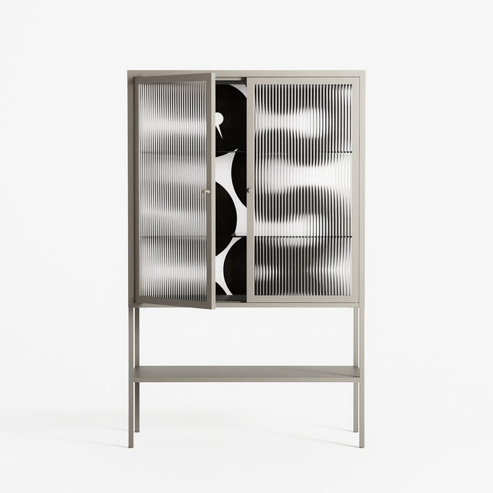 Black Waves by Alexander Khabbazi, displayed within the Vitrine Loft Cabinet behind Reeded glass. Finished in the colour Pebble, the cabinet becomes a frame for the artwork and the objects within.