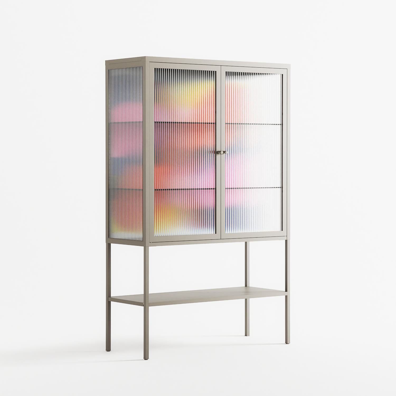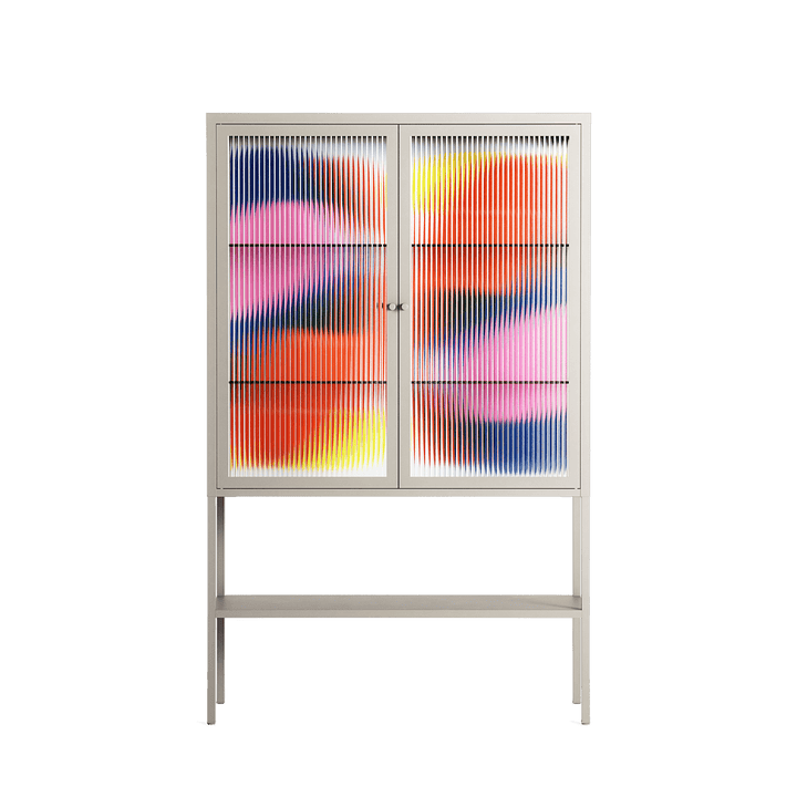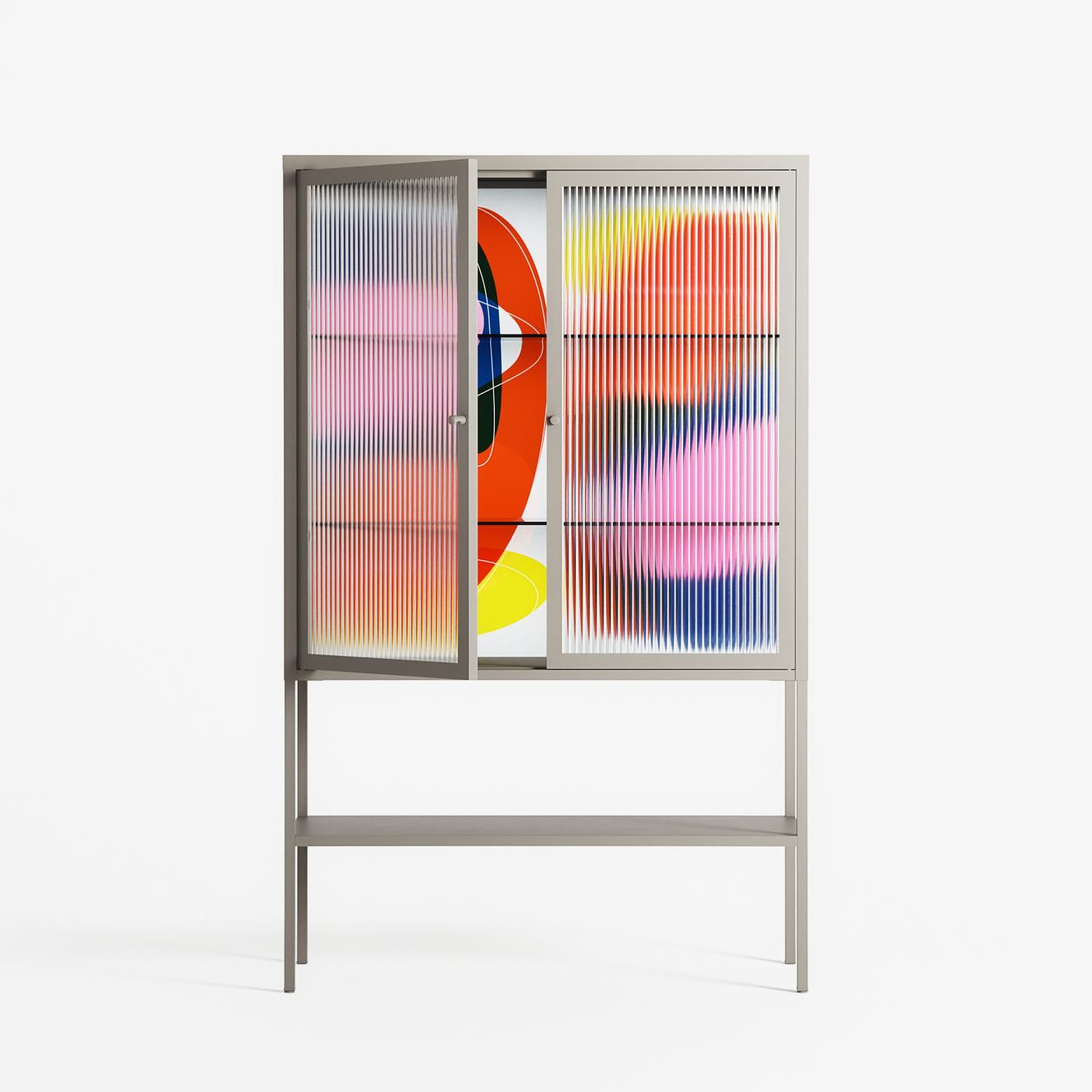 Blends by Vratislav Pecka, displayed within the Vitrine Loft Cabinet behind Reeded glass. Finished in the colour Pebble, the cabinet becomes a frame for the artwork and the objects within.