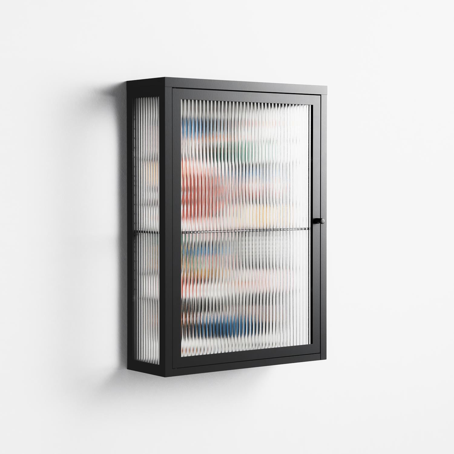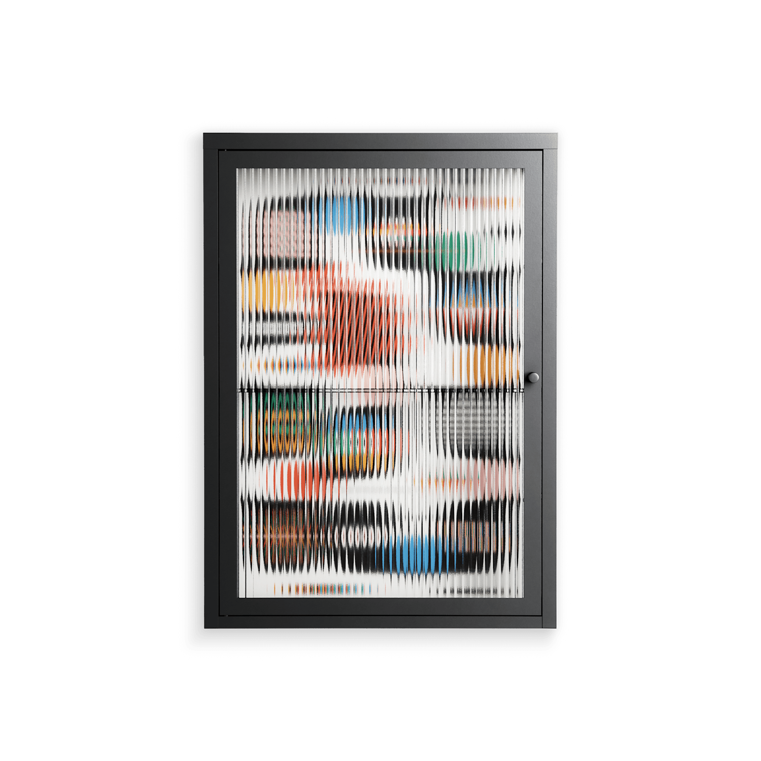Connections by Vratislav Pecka, displayed within the Vitrine Wall Cabinet behind Reeded glass. Finished in the colour Antracite, the cabinet becomes a frame for the artwork and the objects within.