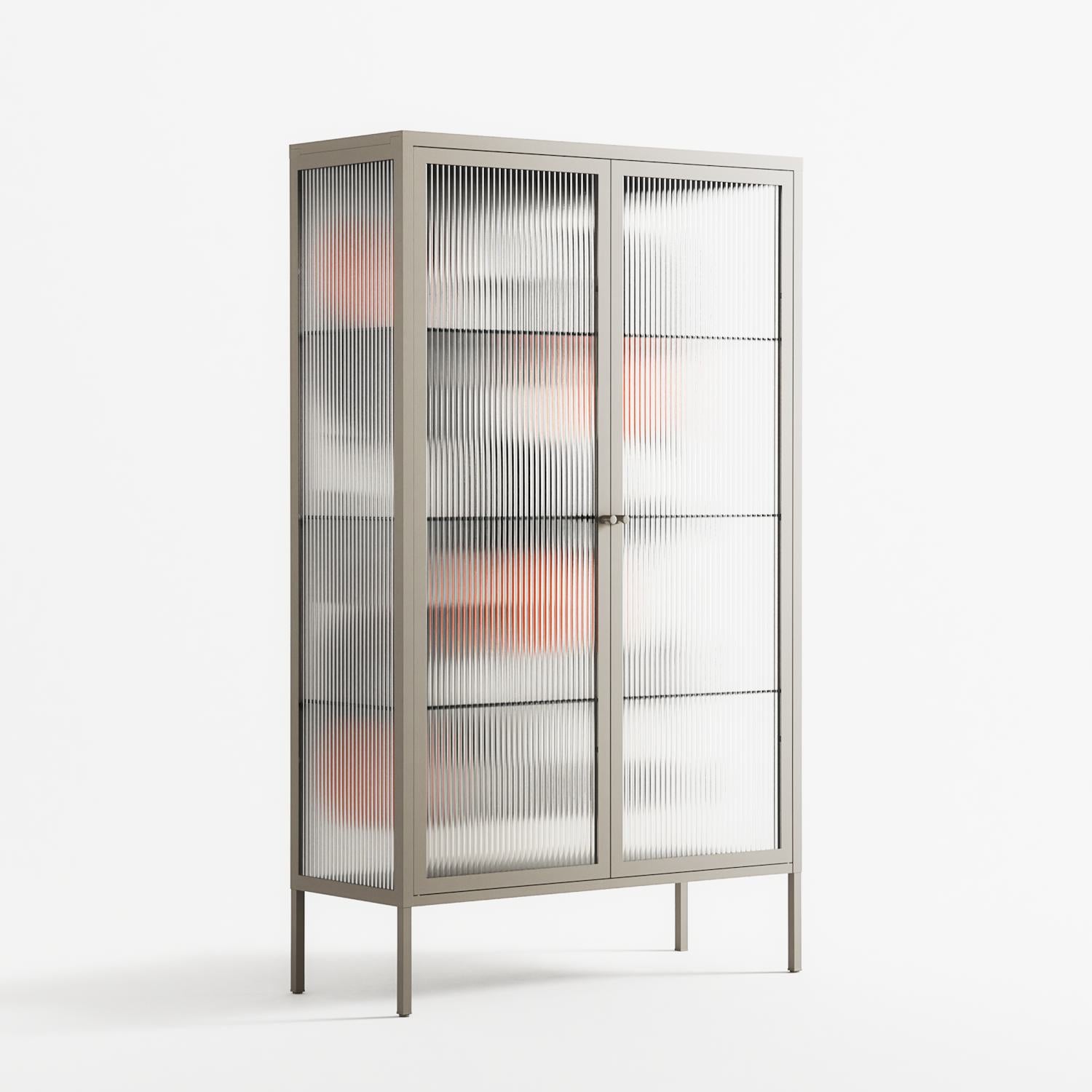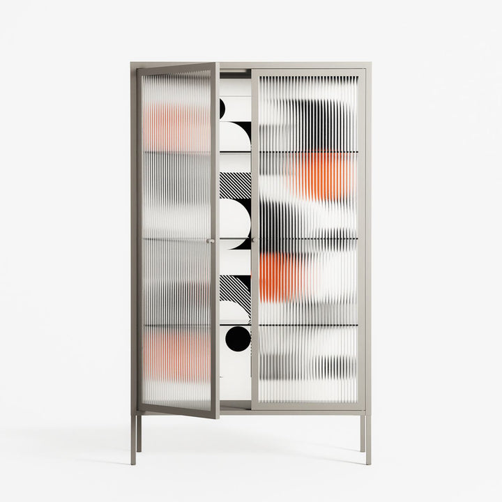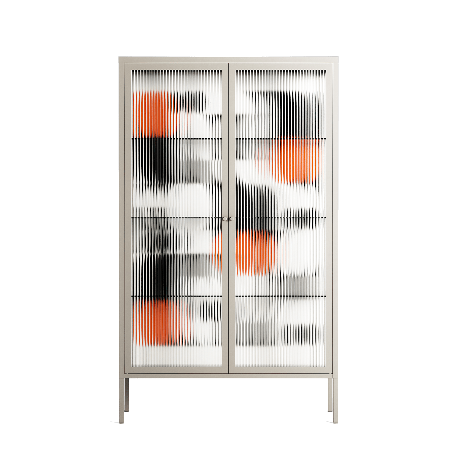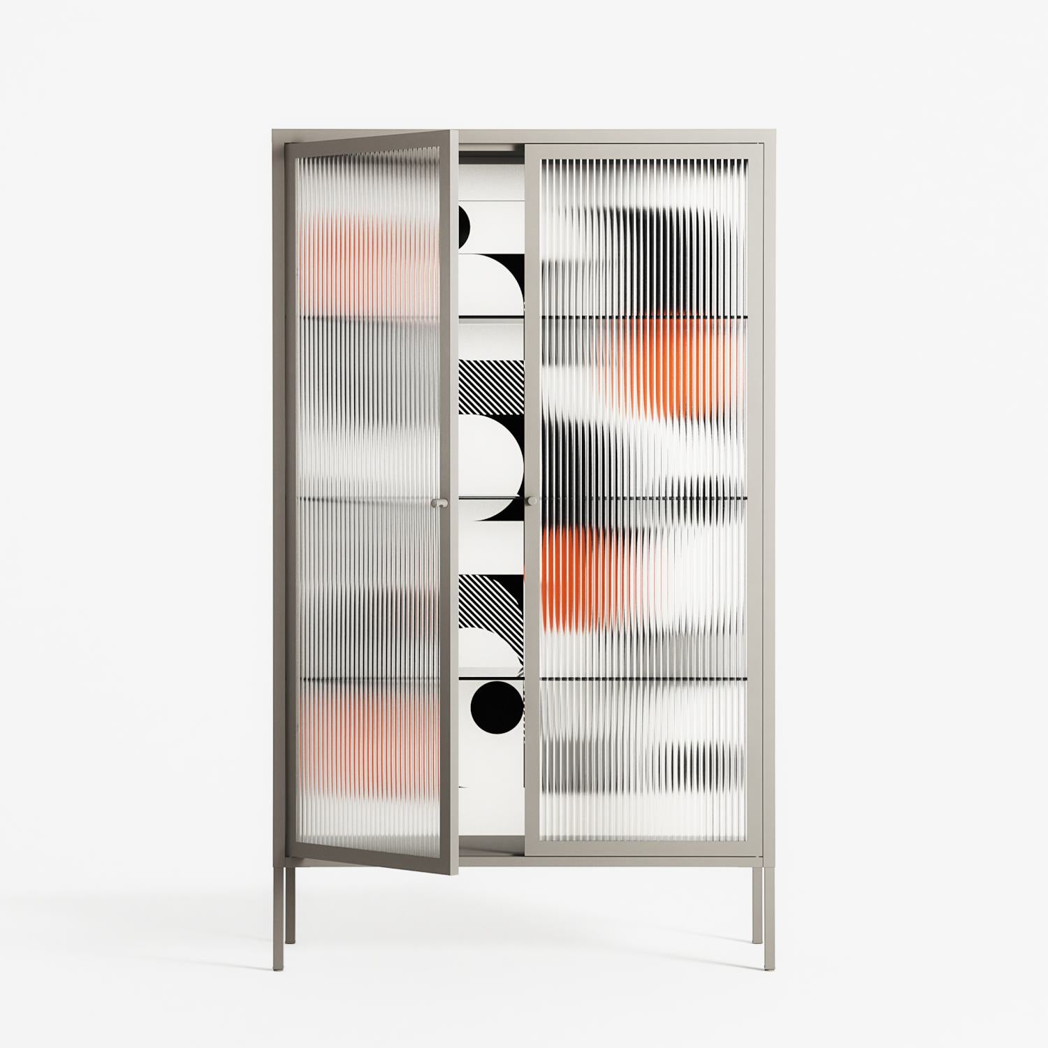 Conserto by Vratislav Pecka, displayed within the Vitrine Cabinet behind Reeded glass. Finished in the colour Pebble, the cabinet becomes a frame for the artwork and the objects within.