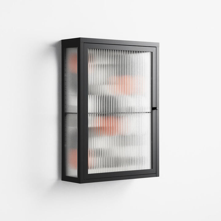 Conserto by Vratislav Pecka, displayed within the Vitrine Wall Cabinet behind Reeded glass. Finished in the colour Antracite, the cabinet becomes a frame for the artwork and the objects within.