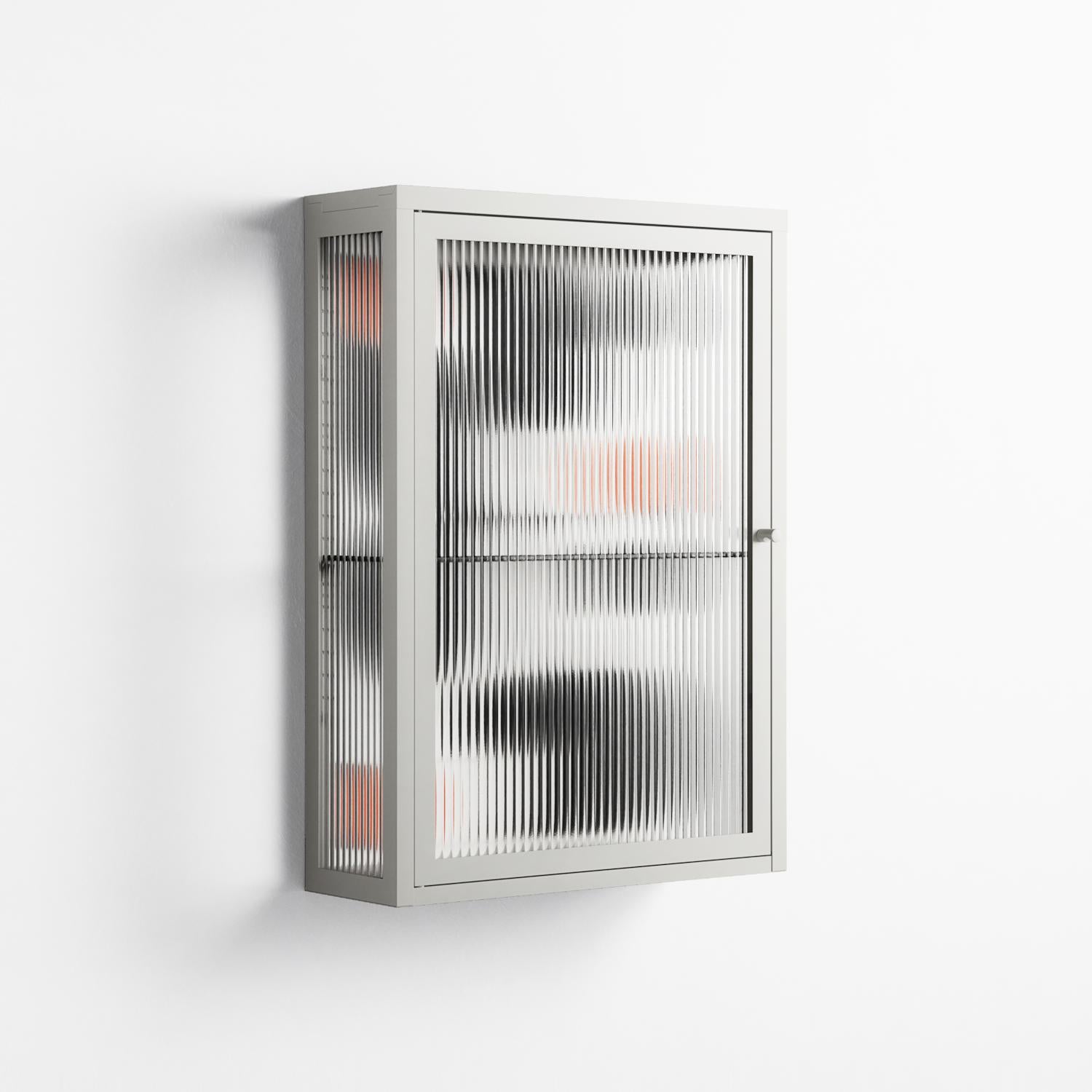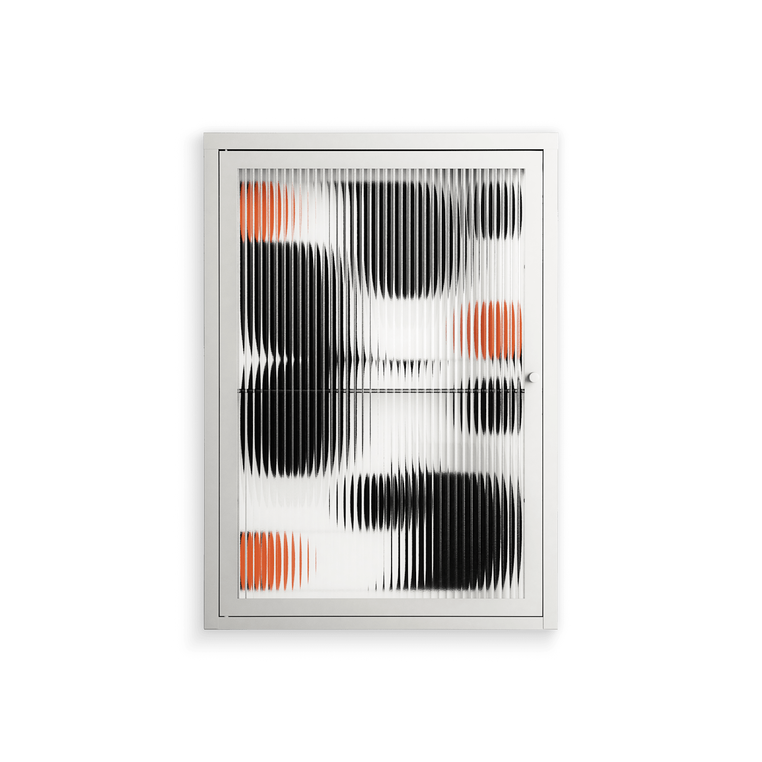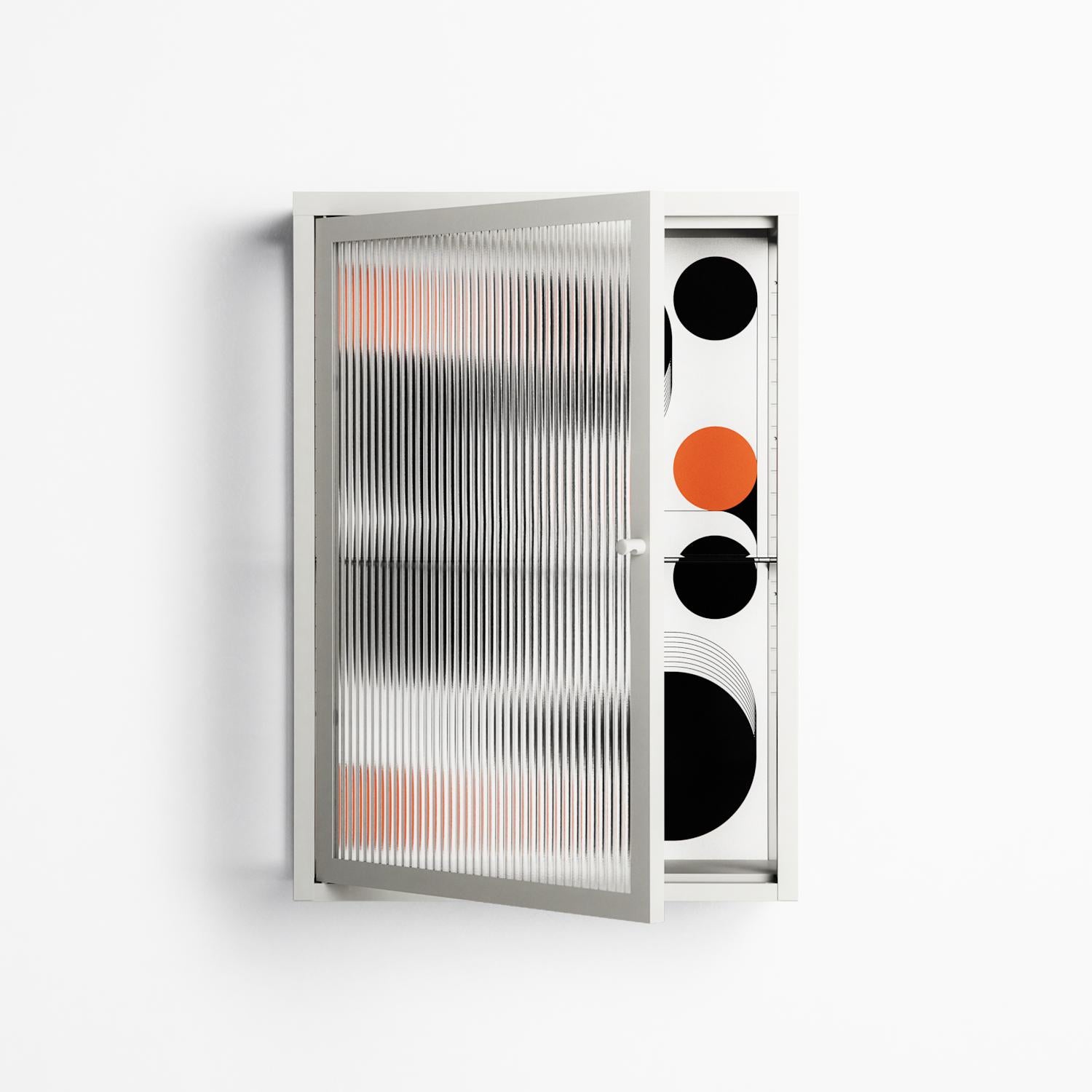 Conserto2 by Vratislav Pecka, displayed within the Vitrine Wall Cabinet behind Reeded glass. Finished in the colour Chalk, the cabinet becomes a frame for the artwork and the objects within.