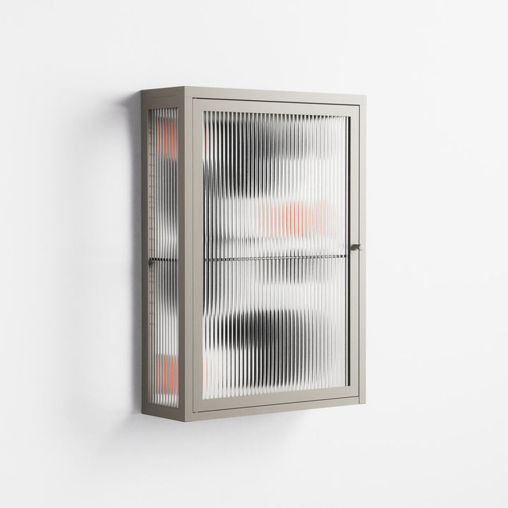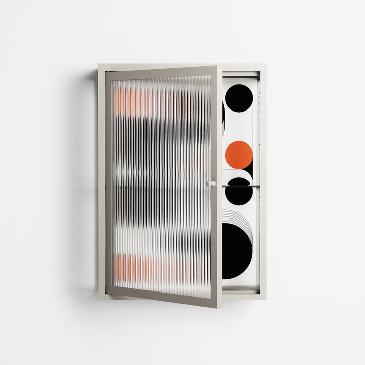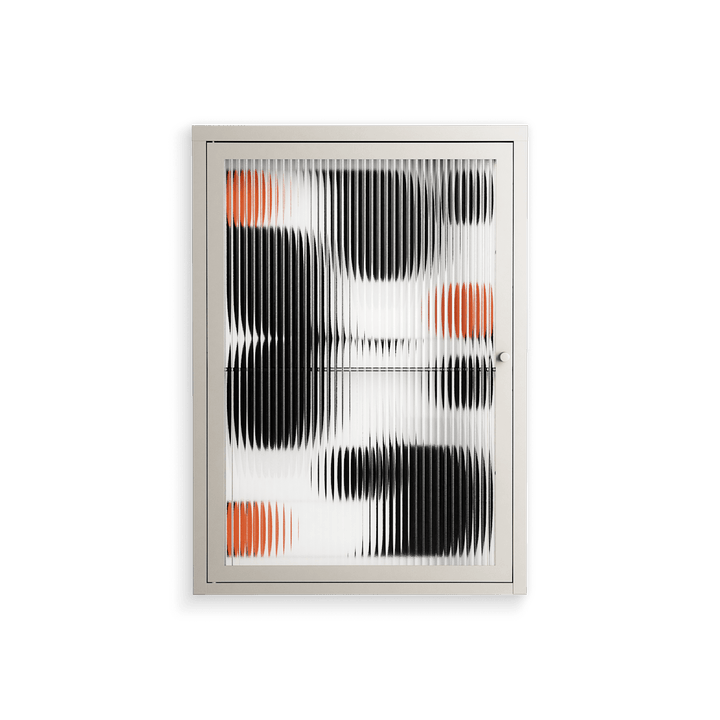 Conserto2 by Vratislav Pecka, displayed within the Vitrine Wall Cabinet behind Reeded glass. Finished in the colour Pebble, the cabinet becomes a frame for the artwork and the objects within.