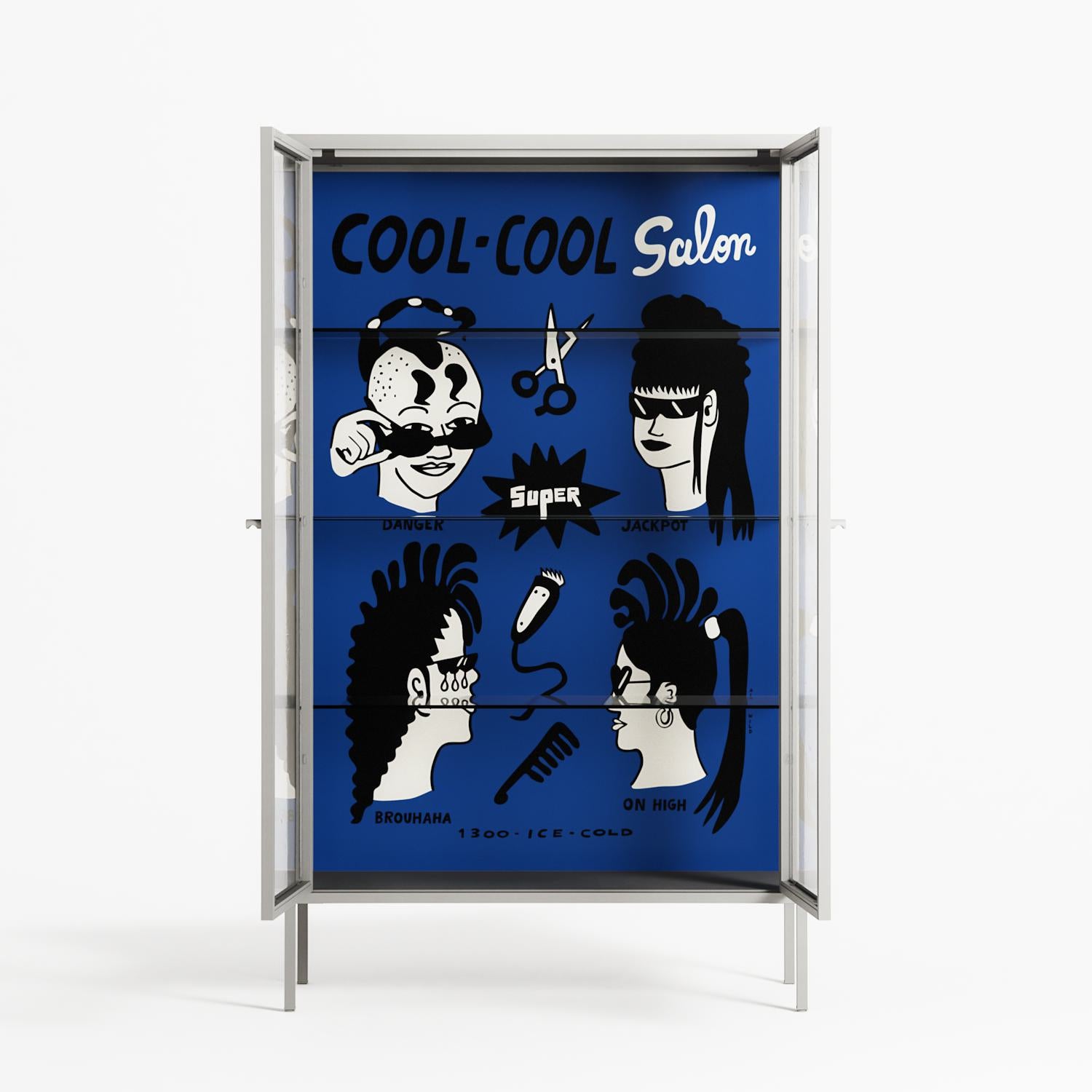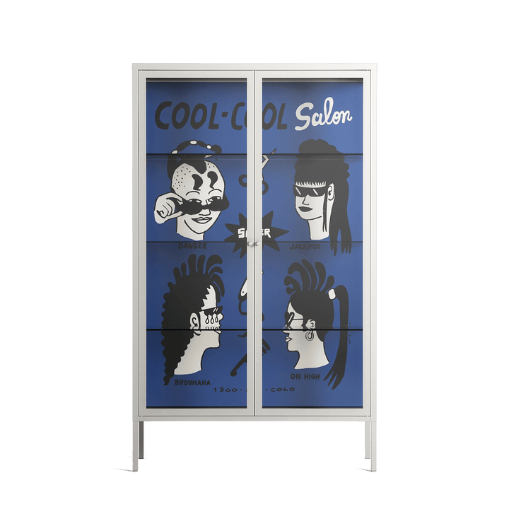 Cool Cool Salon Blue by Aley Wild, displayed within the Vitrine Cabinet behind Clear glass. Finished in the colour Chalk, the cabinet becomes a frame for the artwork and the objects within.