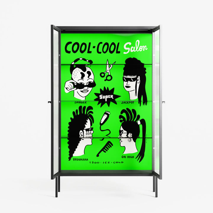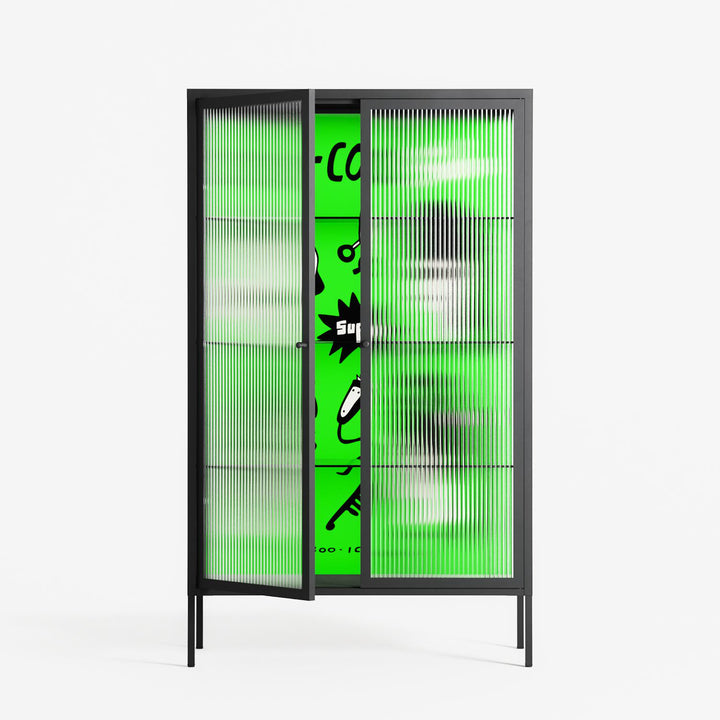 Cool Cool Salon Green by Aley Wild, displayed within the Vitrine Cabinet behind Reeded glass. Finished in the colour Antracite, the cabinet becomes a frame for the artwork and the objects within.