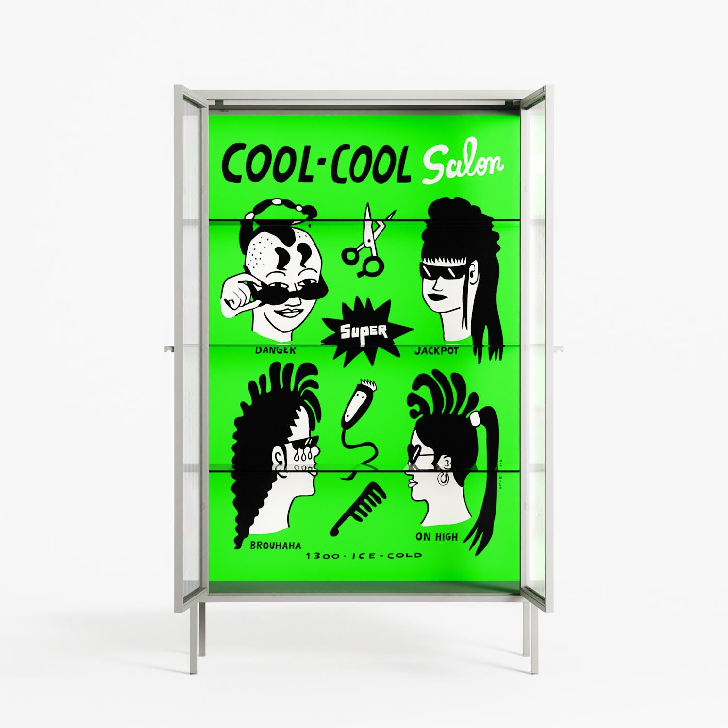 Cool Cool Salon Green by Aley Wild, displayed within the Vitrine Cabinet behind Reeded glass. Finished in the colour Chalk, the cabinet becomes a frame for the artwork and the objects within.