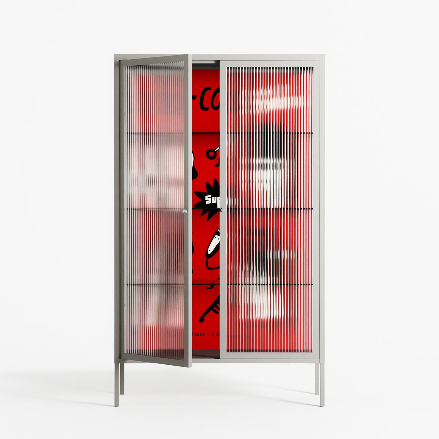 Cool Cool Salon Red by Aley Wild, displayed within the Vitrine Cabinet behind Reeded glass. Finished in the colour Chalk, the cabinet becomes a frame for the artwork and the objects within.