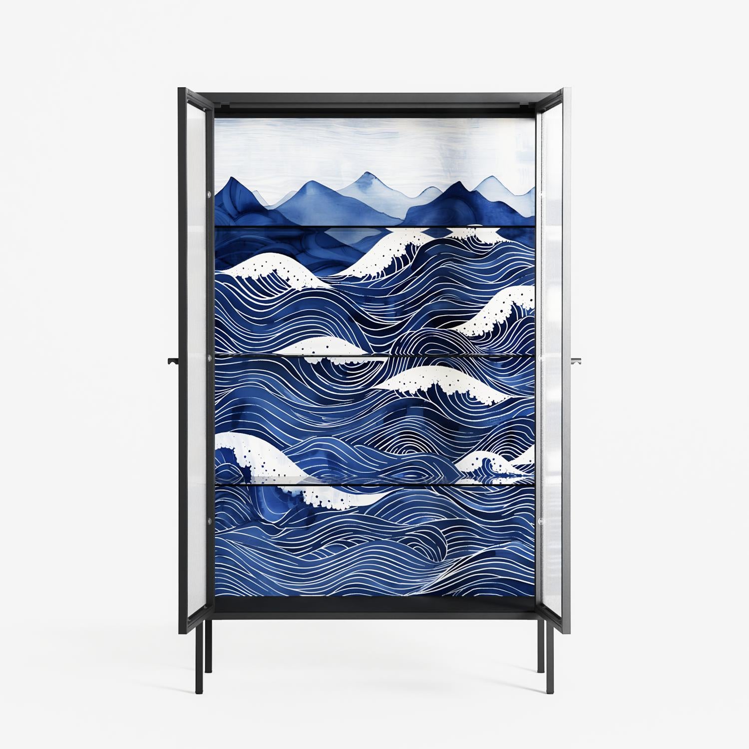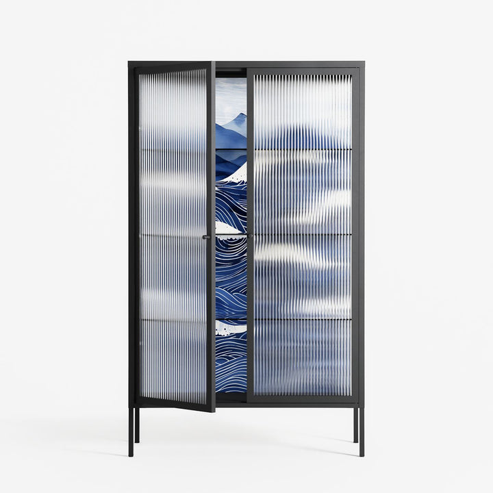 Dalgalar by Nur Rydberg, displayed within the Vitrine Cabinet behind Reeded glass. Finished in the colour Antracite, the cabinet becomes a frame for the artwork and the objects within.