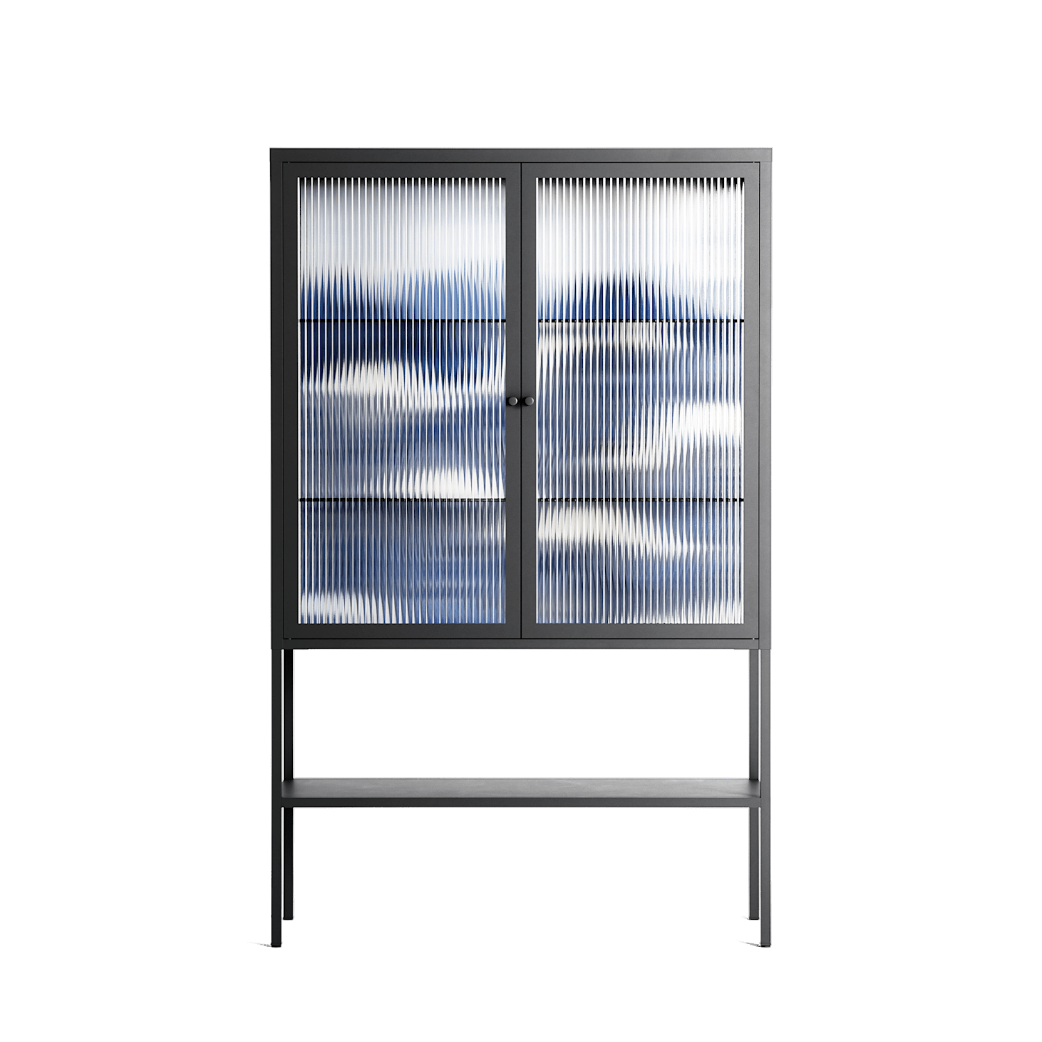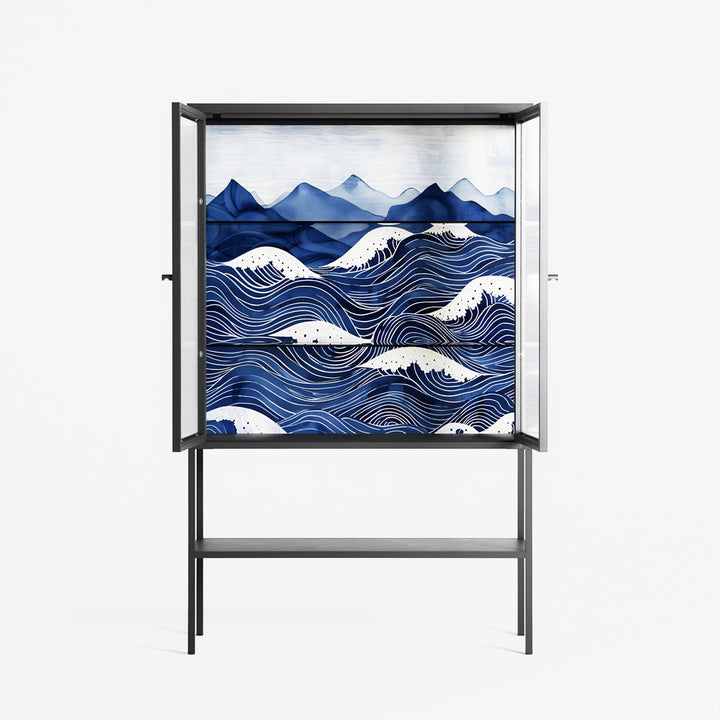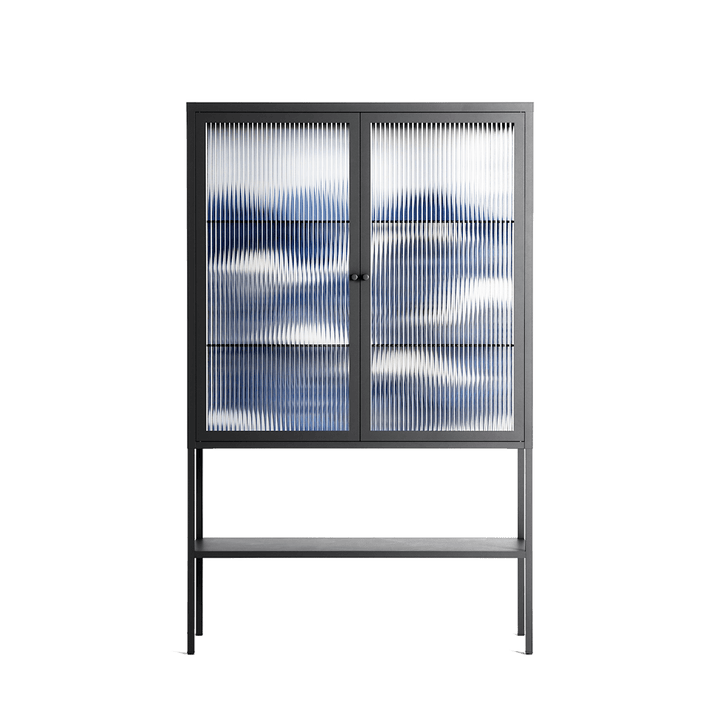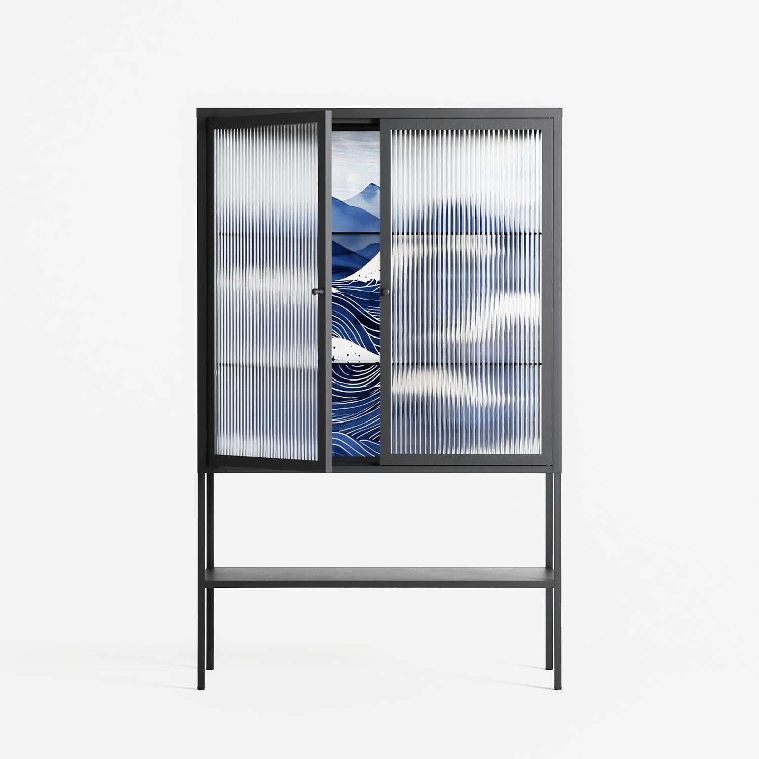 Dalgalar by Nur Rydberg, displayed within the Vitrine Loft Cabinet behind Reeded glass. Finished in the colour Antracite, the cabinet becomes a frame for the artwork and the objects within.