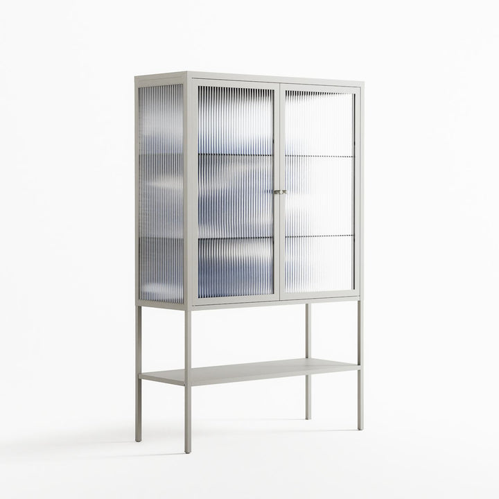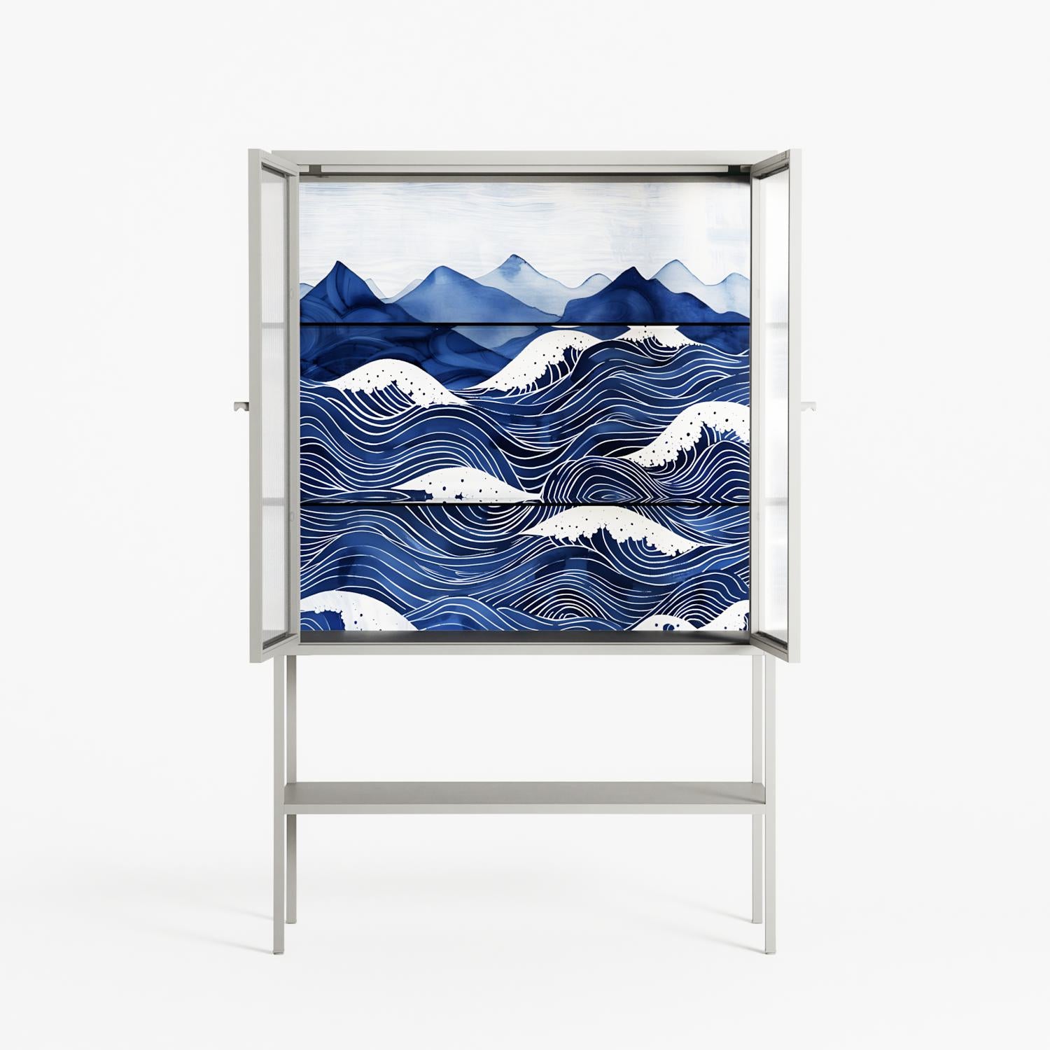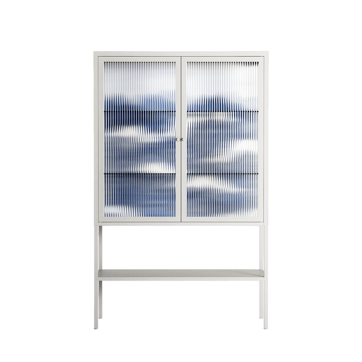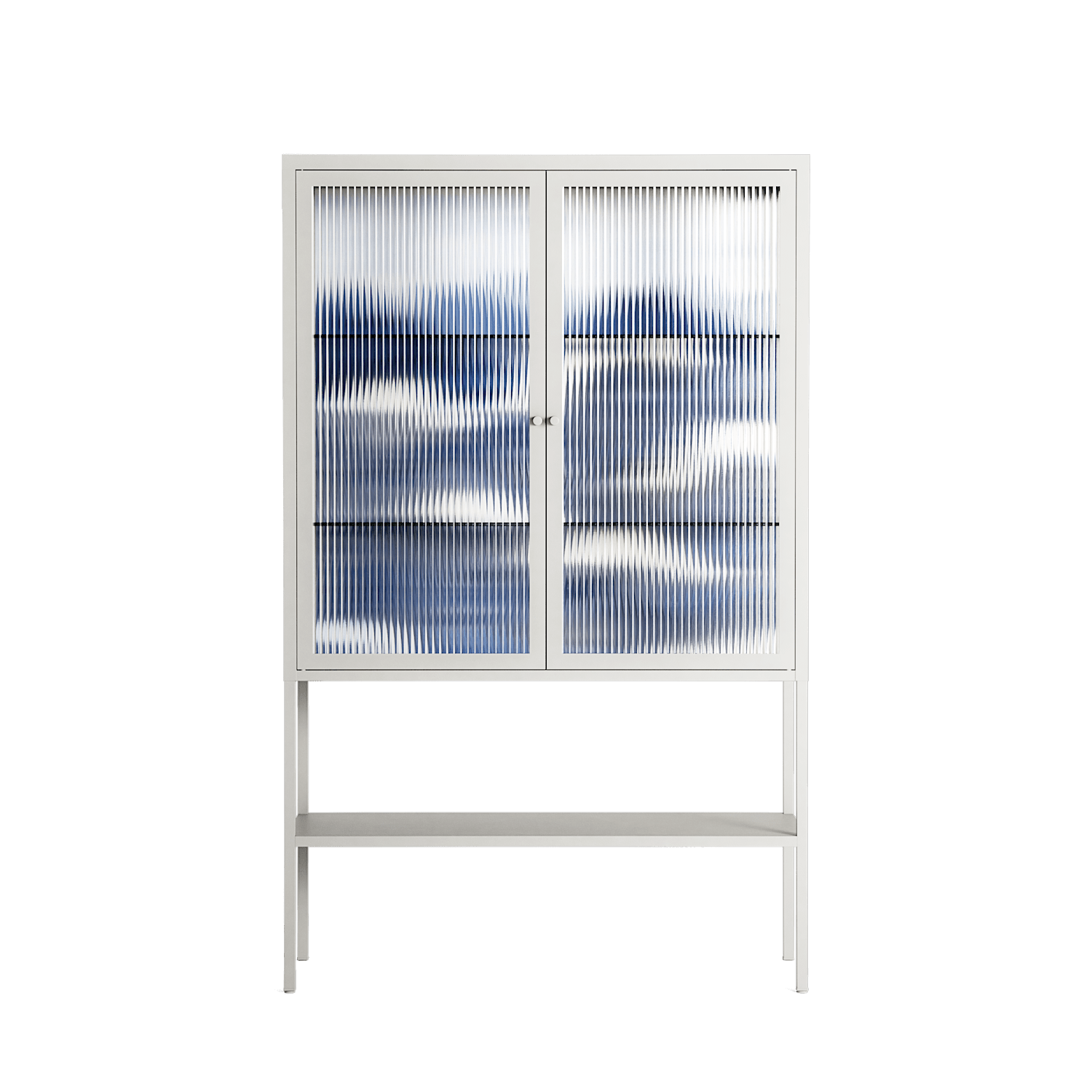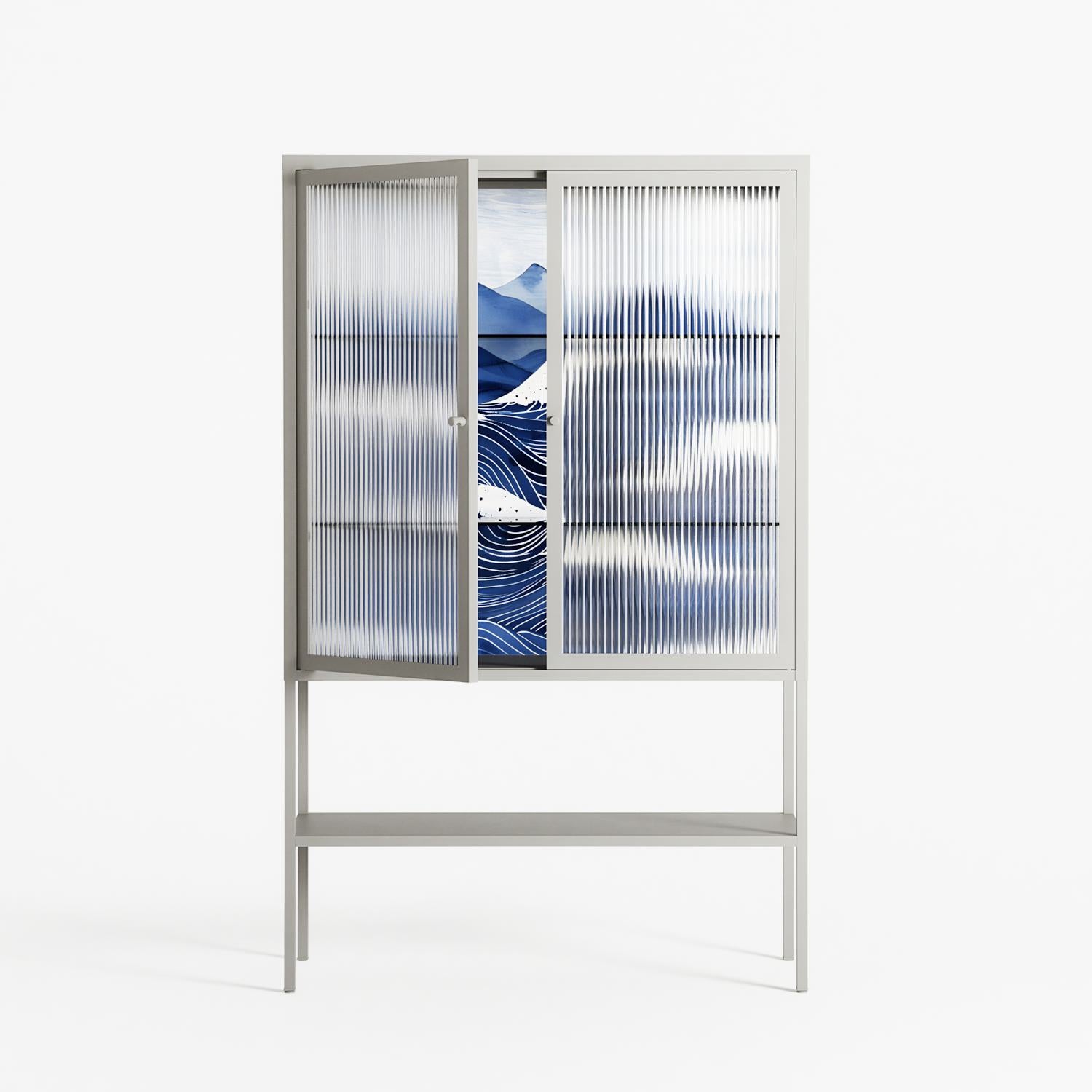 Dalgalar by Nur Rydberg, displayed within the Vitrine Loft Cabinet behind Reeded glass. Finished in the colour Chalk, the cabinet becomes a frame for the artwork and the objects within.