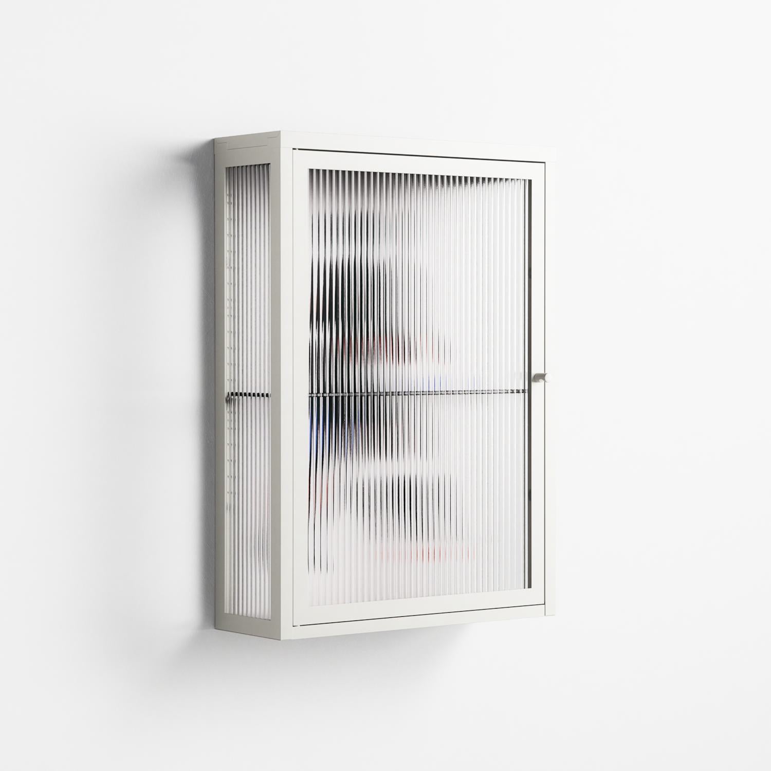 Décomposé by David Vanadia, displayed within the Vitrine Wall Cabinet behind Reeded glass. Finished in the colour Chalk, the cabinet becomes a frame for the artwork and the objects within.