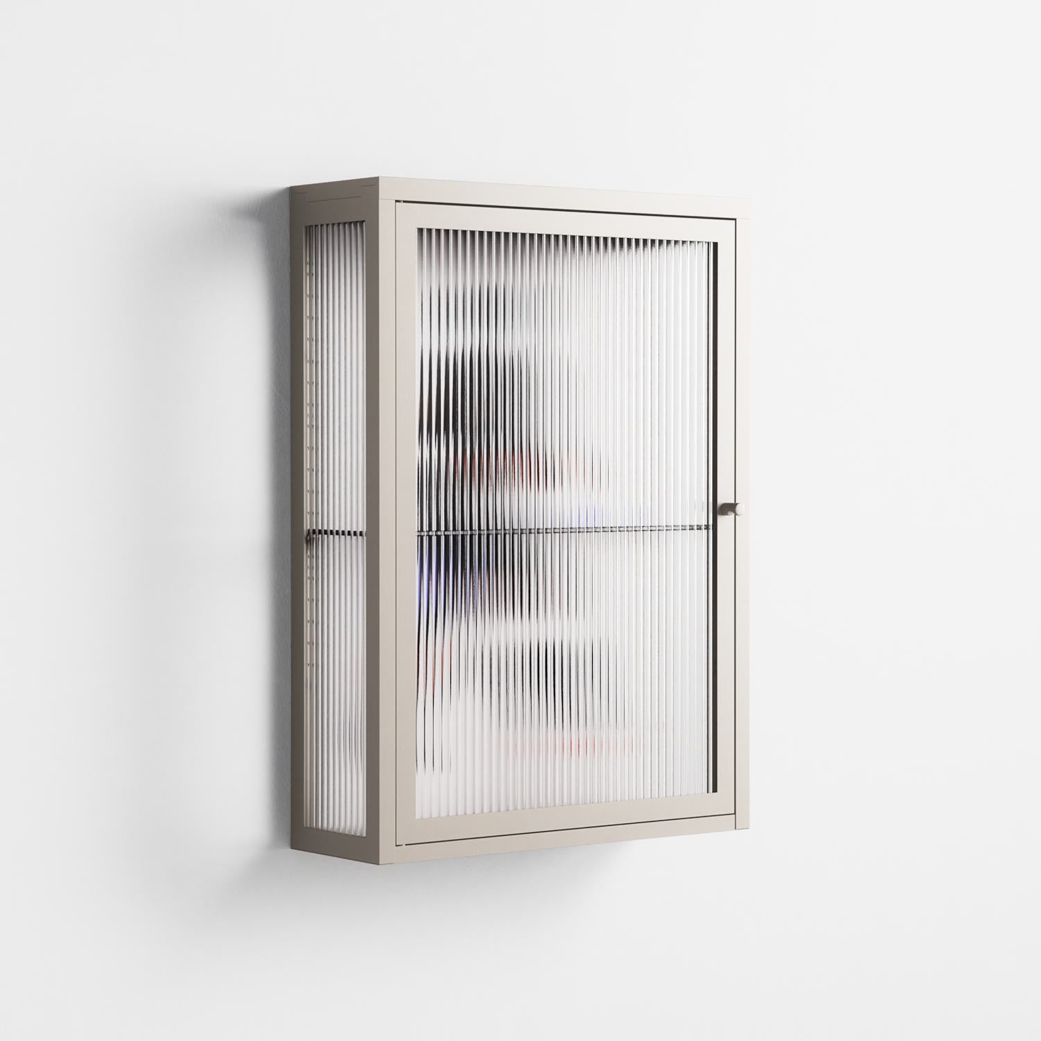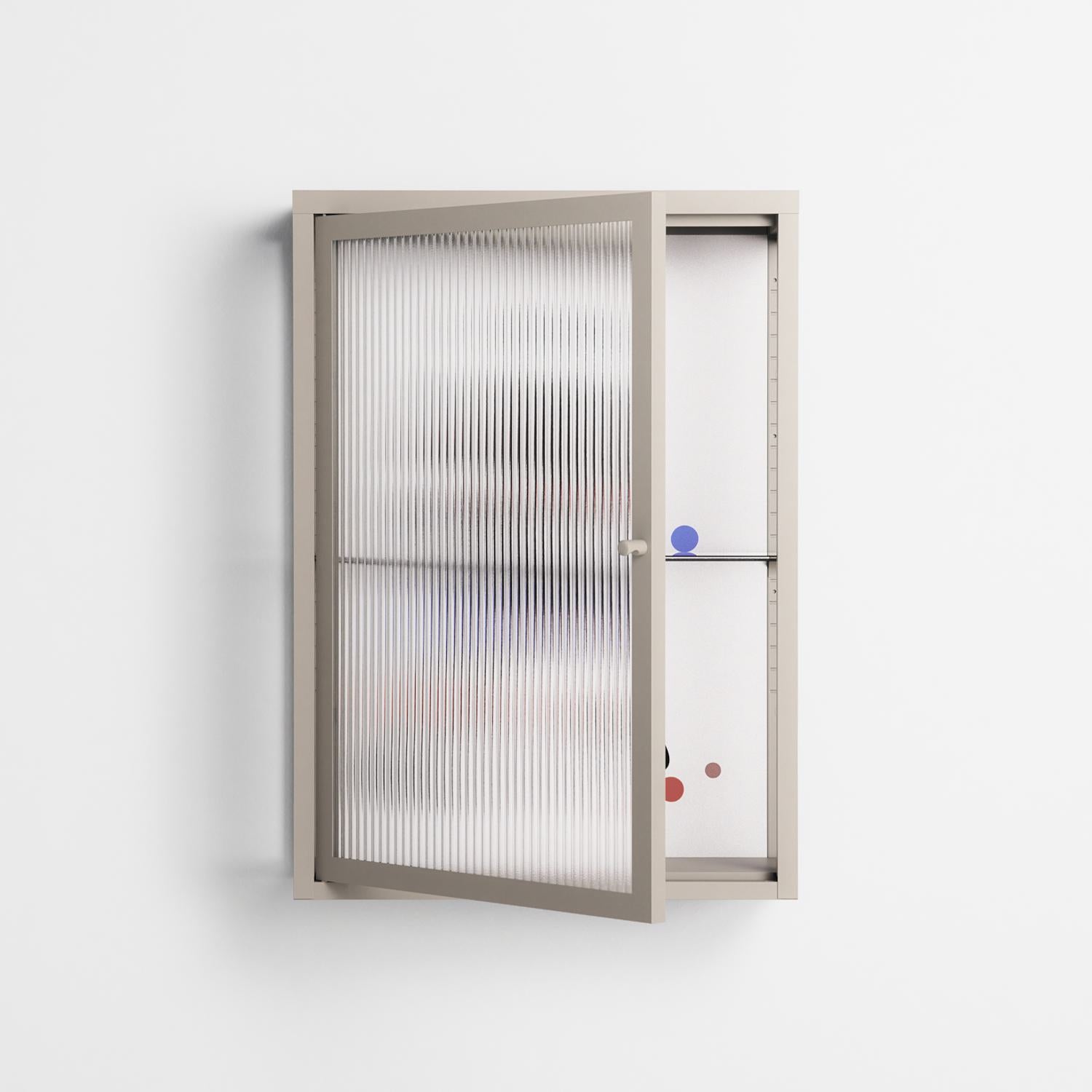 Décomposé by David Vanadia, displayed within the Vitrine Wall Cabinet behind Reeded glass. Finished in the colour Pebble, the cabinet becomes a frame for the artwork and the objects within.